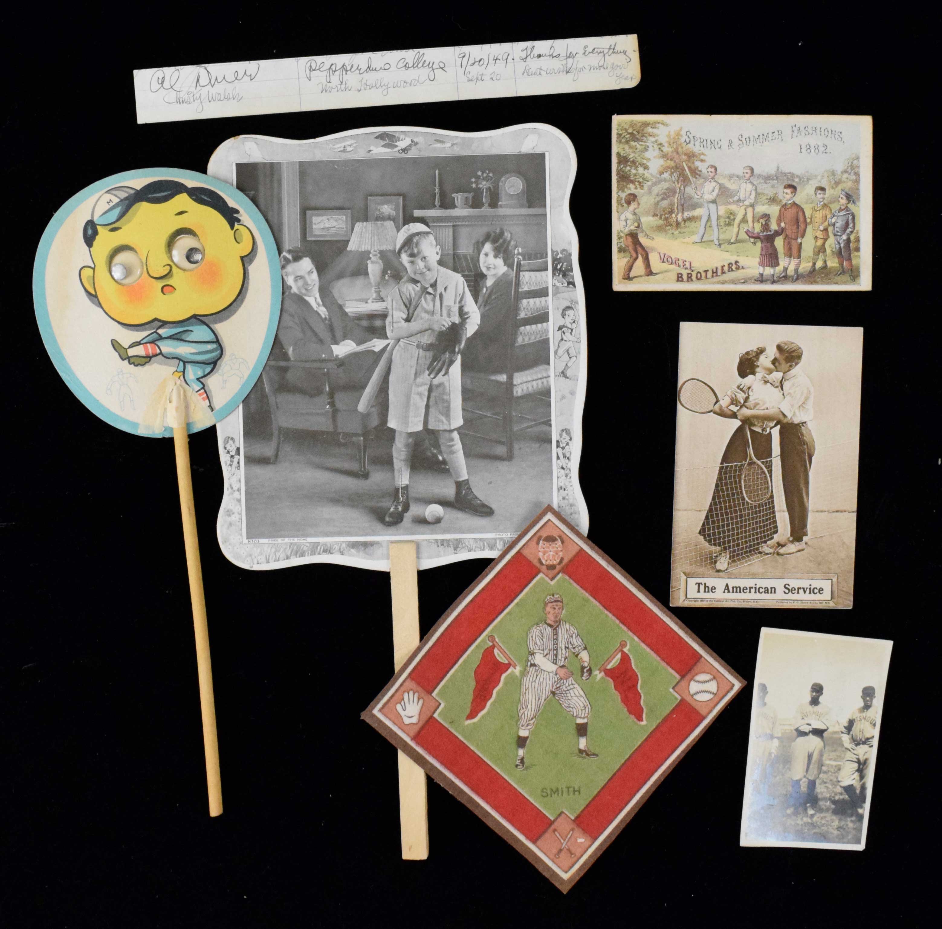 Description:Lot of vintage sports memorabilia and flats (FR/GD-NM). Includes 1882 Vogel Brothers trade card with baseball scene on the front (FR/GD), 1910 "The American Service" kissing tennis players postcard (EX), 1914 B18 Red Smith blanket with green infield (EX/MT-NM), c.1910s-20s baseball themed hand fan (VG), c.1930s 2.5"x4.25" snapshot photo picturing what appears to be (3) Portsmouth Cubs (EX), c.1940s-50s baseball themed hand fan (GD stick nearly detached), and a Christy Walsh cut signature (EX/MT).