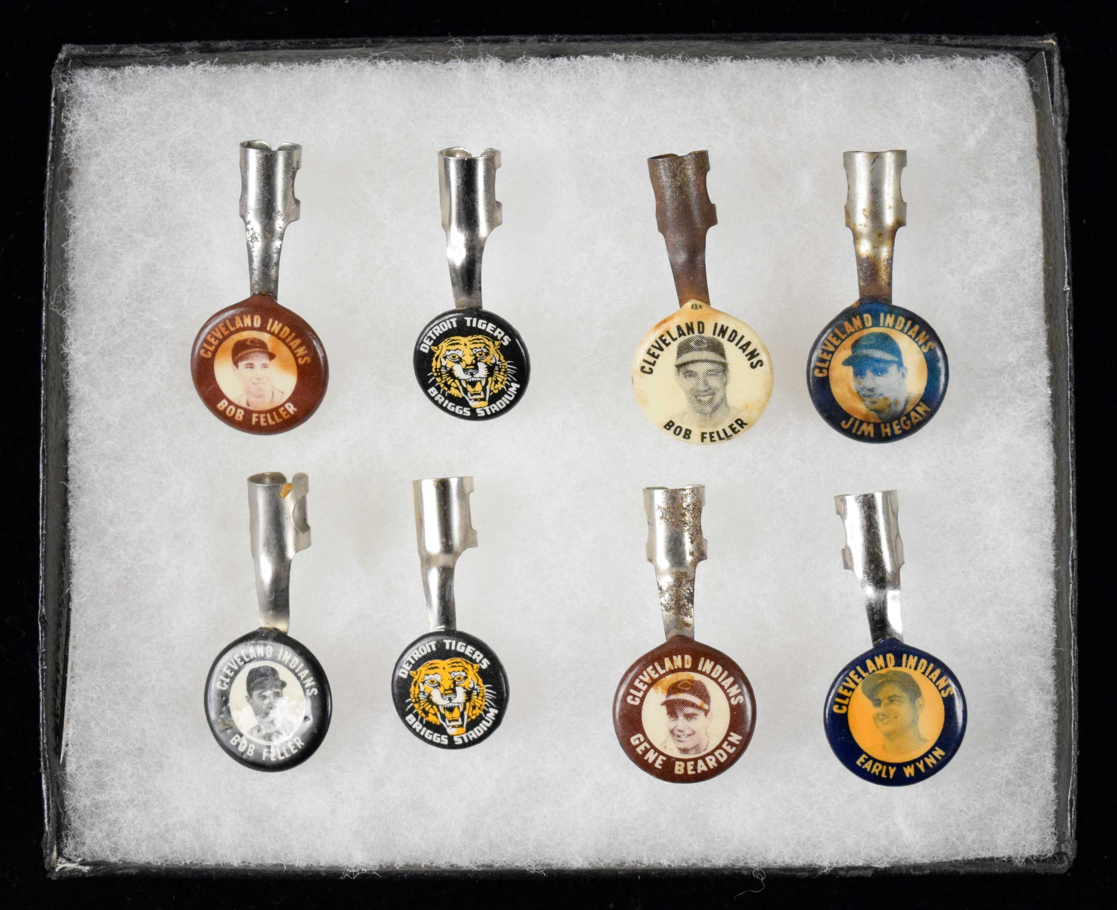 Description:Lot of (8) vintage baseball pencil clips including (3) Feller, c.1940s-50s (GD-NM). Includes (2) Detroit Tigers (EX/MT-NM), (3) different Bob Feller (GD-G/VG-VG), Early Wynn (VG), Jim Hegan (G/VG), and Gene Bearden (VG).