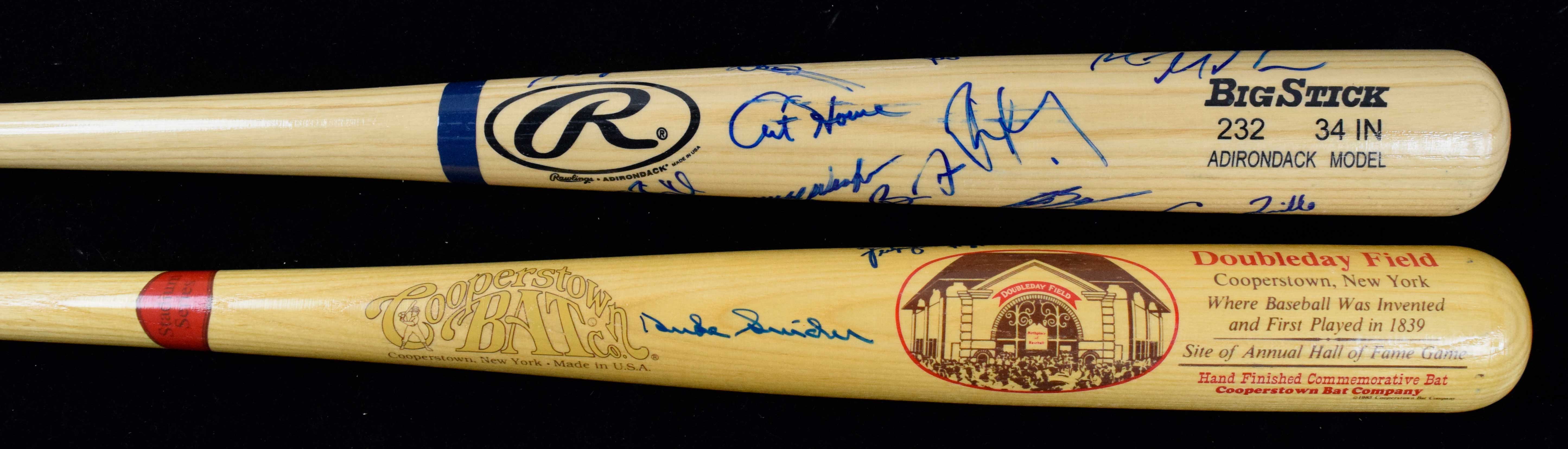 Description:HOFers multi-signed baseball bat and 2002 Oakland A's team signed bat (EX/MT-NM). Includes 34" Cooperstown Bat Co. Doubleday Field bat multi-signed by Duke Snider, Fergie Jenkins, and Reggie Jackson; and 34" Rawlings-Adirondack Big Stick signed by (20) members of the 2002 American League West champion Oakland Athletics: Art Howe, Mark Mulder, Barry Zito, Cory Lidle, Dave Justice, Scott Hatteberg, Jermaine Dye, Billy Koch, Ramon Hernandez, Chad Bradford, and others. Signatures rate 5/6 to 9/10 (avg 7/8) out of 10: EX/MT-NM