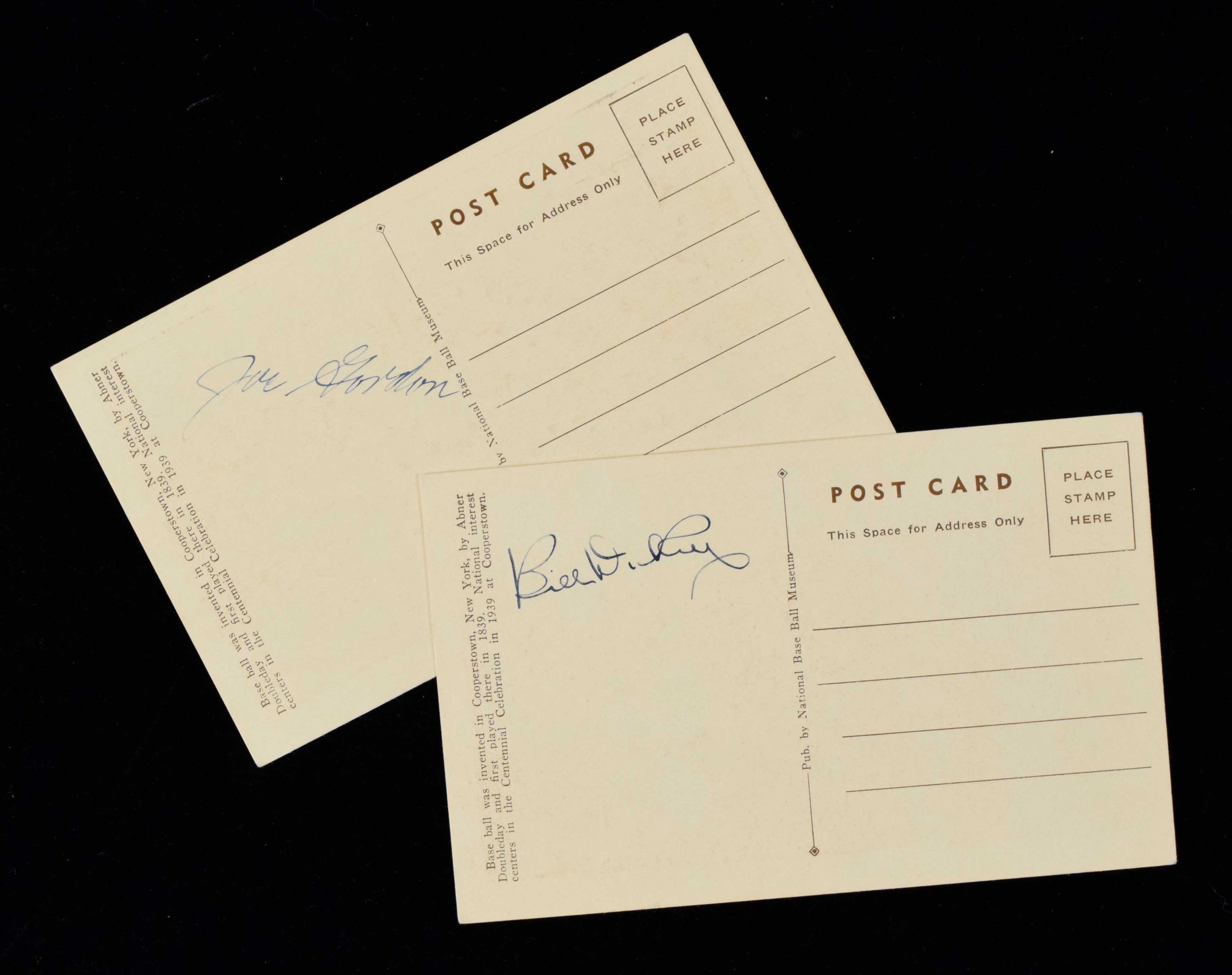Description:Bill Dickey and Joe Gordon signed postcards - PSA/DNA (EX/MT-NM). Both are signed on the back of Baseball HOF Museum postcards. Signatures rate 8 out of 10. Each comes with full LOA from PSA/DNA: EX/MT-NM
