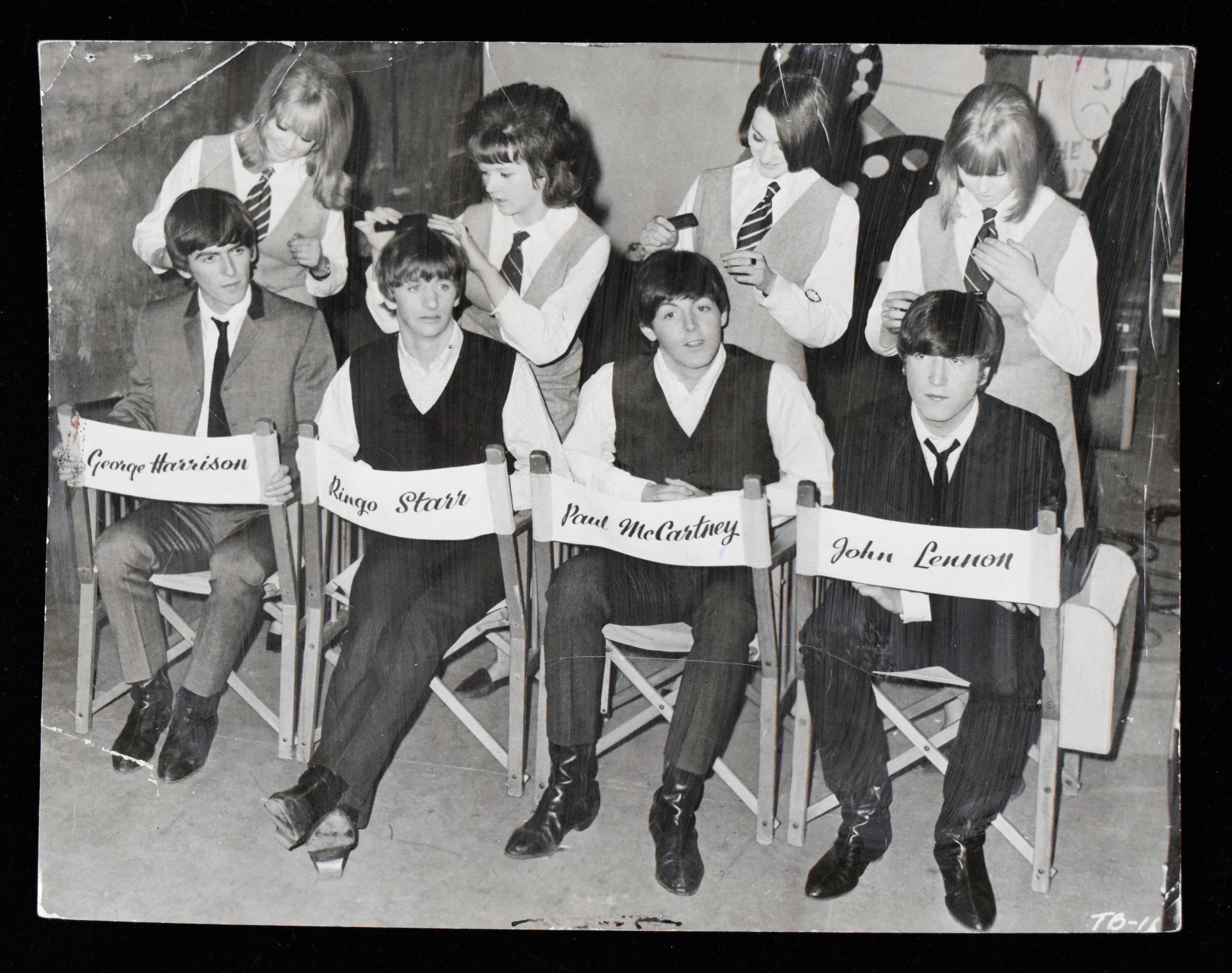 Description:1964 The Beatles original photograph (GD). 7.25"x9.25" photo picturing George Harrison, Ringo Starr, Paul McCartney, and John Lennon on the set of "A Hard Day's Night" with 1964 date stampings on the back. Handling wear including corner creases and a tape repaired edge tear: GD