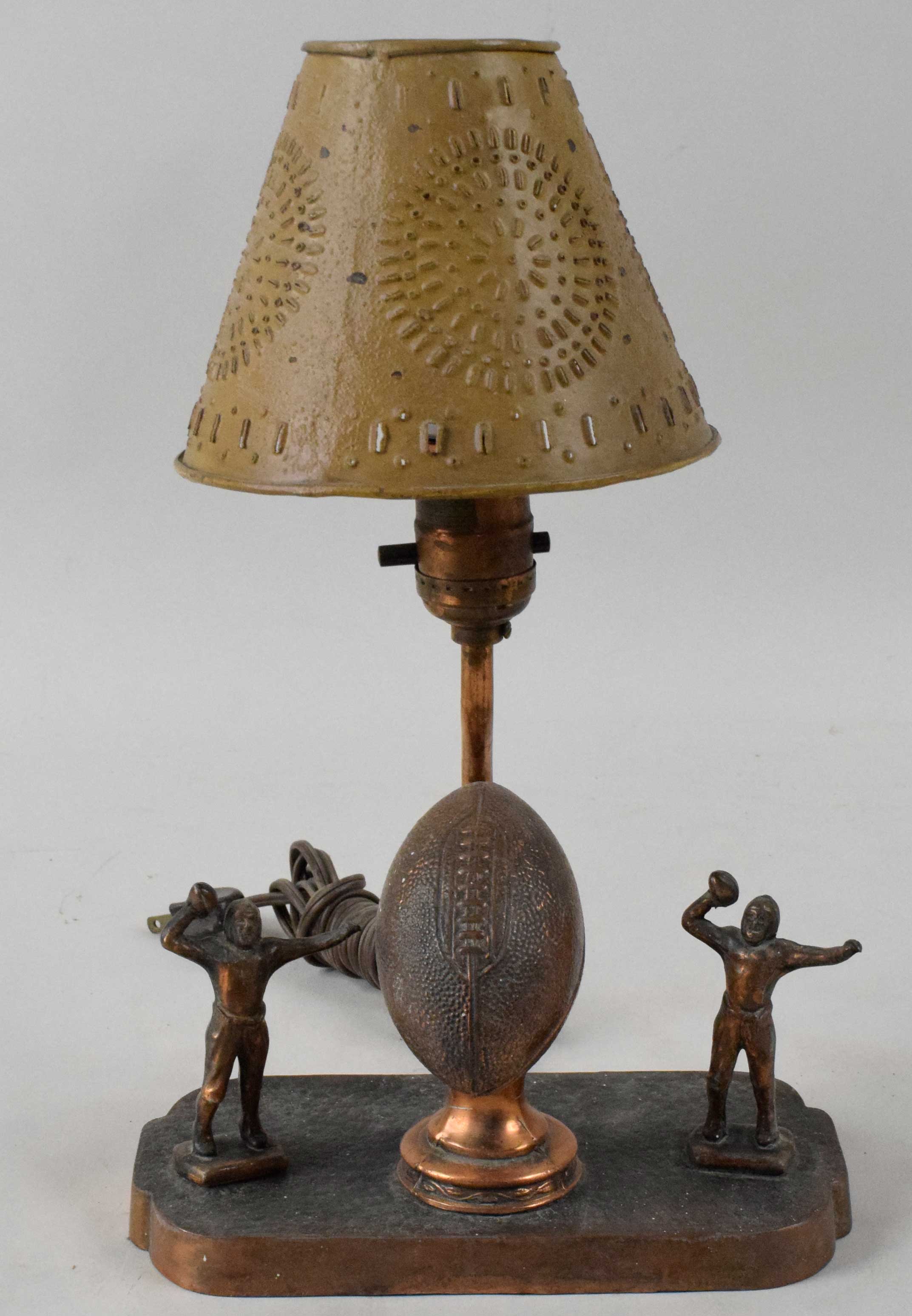 Description:Decorative figural football lamp, c.1930s-40s (EX/MT). Bronze plated desk lamp is football themed with a trio of figural pieces on the base. Currently in working order, but would presumably need to be rewired for safer operation. Light age wear: EX/MT