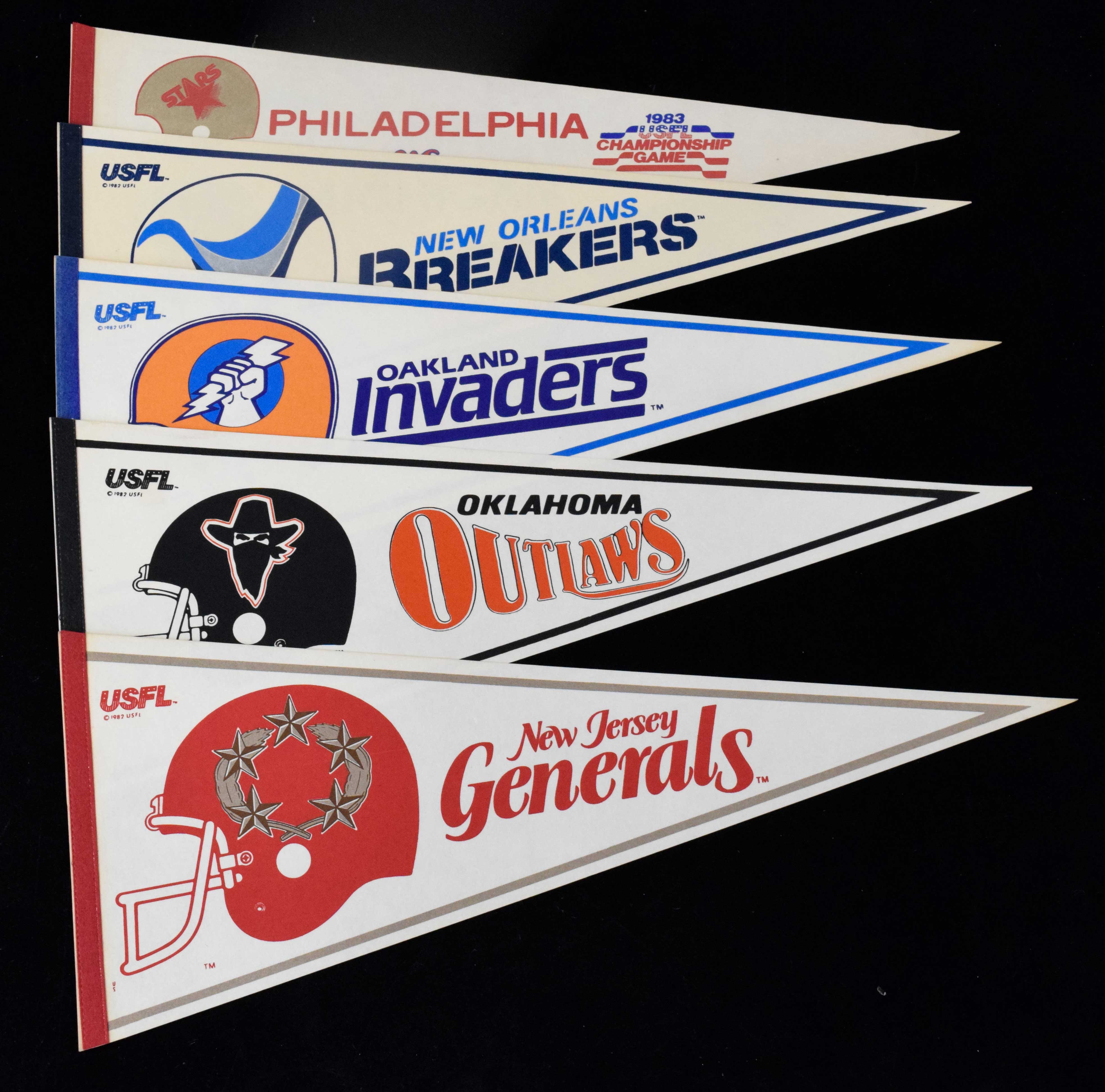Description:Lot of (21) 1980s USFL pennants (VG-NM/MT). All are full size pennants. Includes San Antonio Gunslingers, Pittsburgh Maulers, Philadelphia Stars, Oklahoma Outlaws, (2) New Jersey Generals, Oakland Invaders, Michigan Panthers, Memphis Showboats, Jacksonville Bulls, Houston Gamblers, Denver Gold, Chicago Blitz, Boston Breakers, Birmingham Stallions, Baltimore Stars, Los Angeles Express, Washington Federals, Tampa Bay Bandits, New Orleans Breakers, and 1983 USFL Championship Game. Most appear to average EX/MT-NM overall. Range: VG-NM/MT