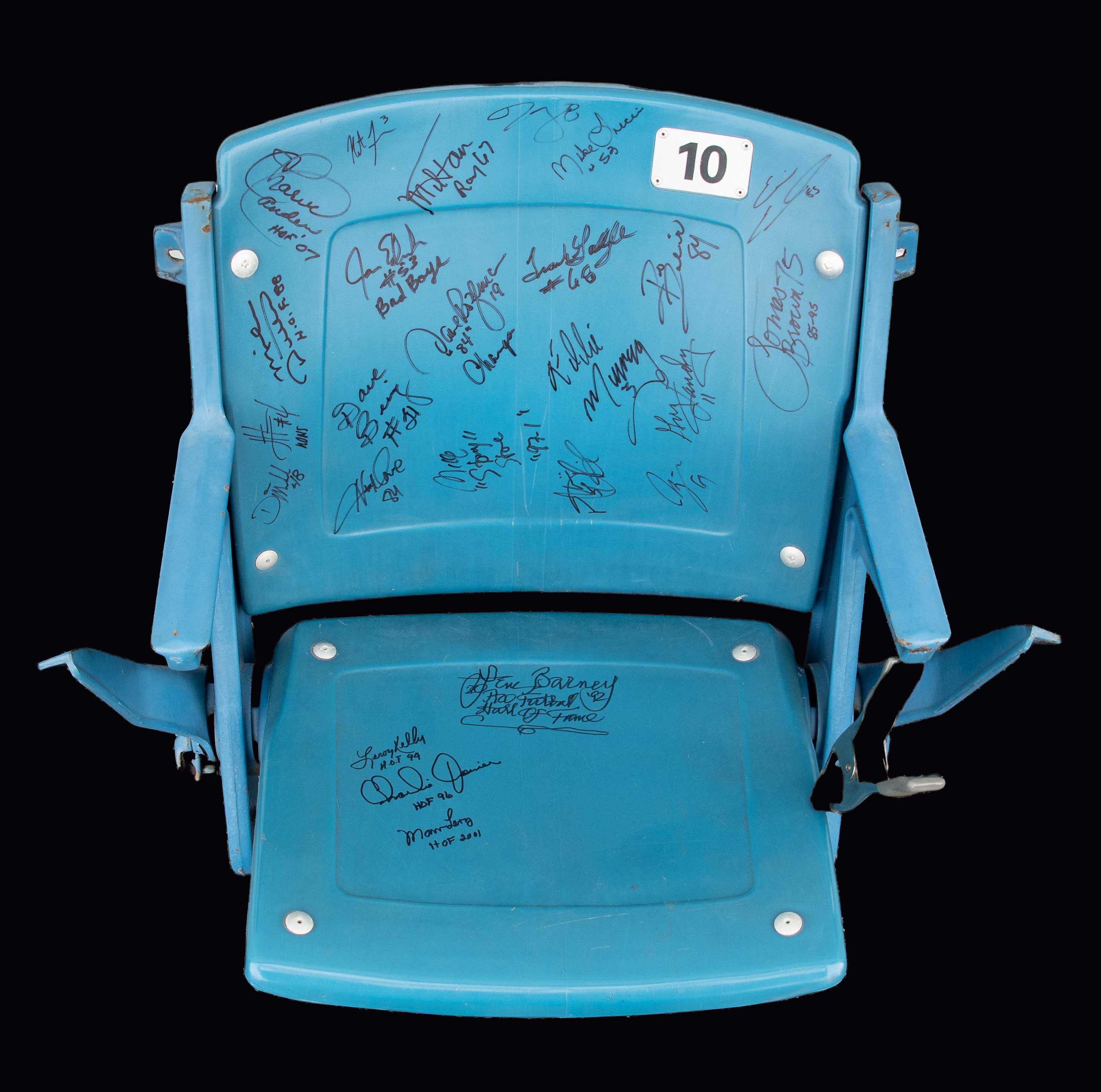 Description:Multi-signed stadium seat with heavy concentration of Detroit players - JSA (EX/MT). Blue #10 seat signed by (25) including Charlie Sanders, Dave Bing, Mike Ditka, Lem Barney, Leroy Kelly, Charlie Joiner, Marv Levy, Greg Landry, Mel Farr, Lomas Brown, Dave Rozema, Jason Hanson, Eric Ebron, and others. Signatures rate 7 to 9/10 (avg 8) out of 10. Includes full LOA from JSA. Mild wear consistent with long term use: EX/MT