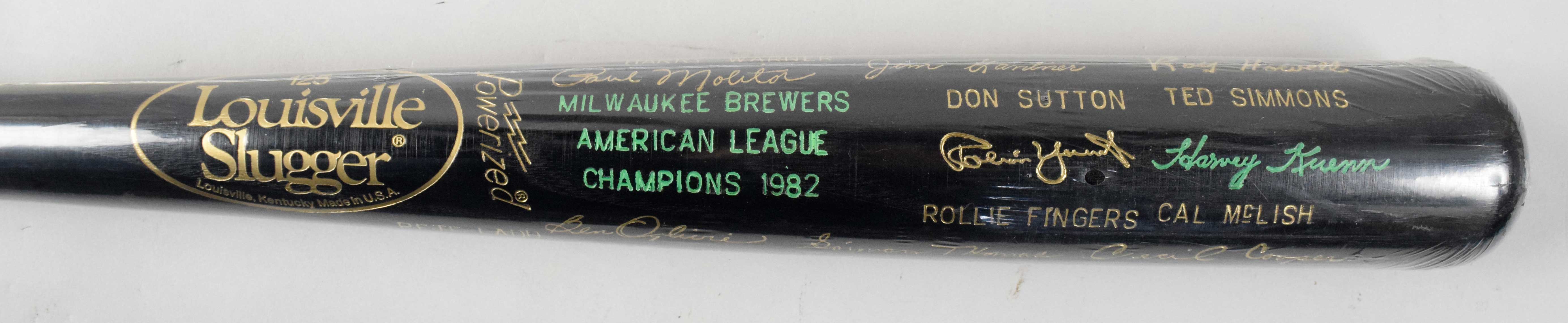 Description:Milwaukee Brewers 1982 American League Champions commemorative baseball bat (NM). 35" Louisville Slugger 125 model bat stamped with names and facsimile signatures of team members including Robin Yount, Don Sutton, Paul Molitor, Ted Simmons, Rollie Fingers, etc: NM