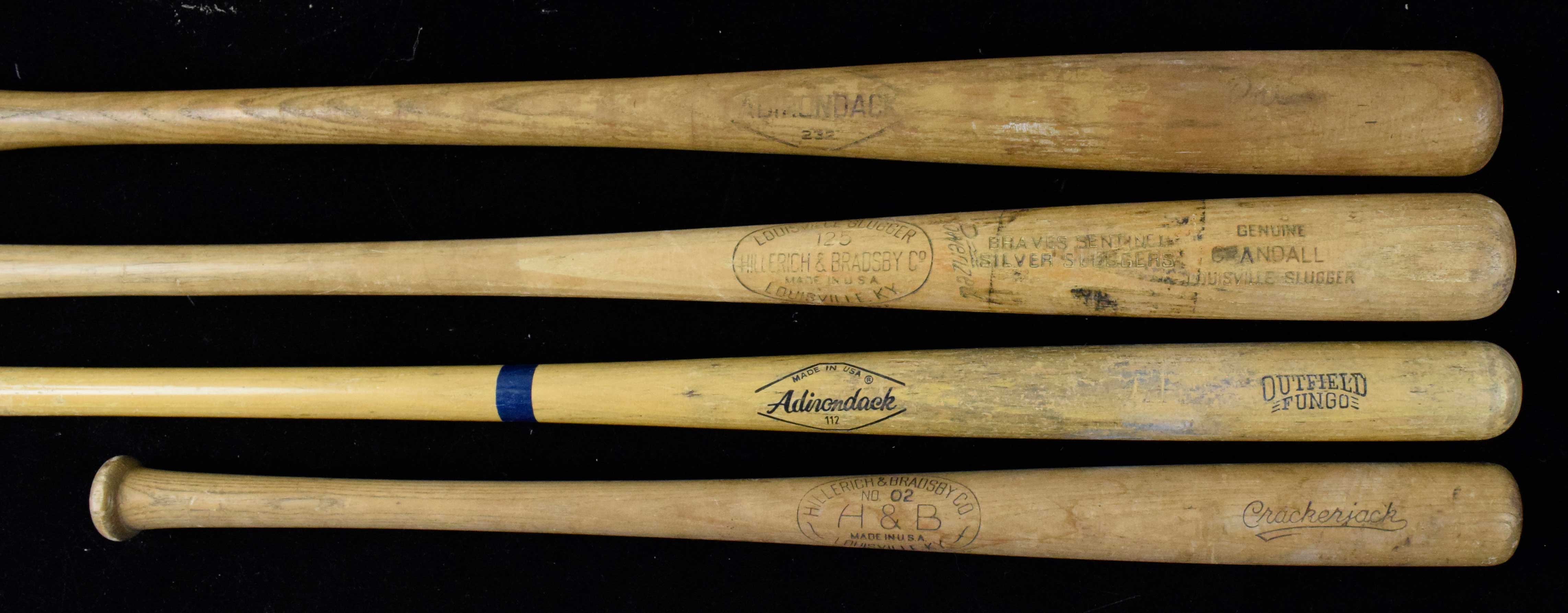 Description:Lot of (11) bats, c.1910s-modern (FR/GD-EX/MT). Includes c.1910s-20s 35" A.J. Reach Co. "The Burley" bat, c.1920s-30s 28" A.J. Reach Co. 87 model youth bat, c.1930s 33" A.H. Leathers Mfg. Co. No. 31 indoor bat, c.1930s-40s 33" Burke-Hanna LDX model softball bat, c.1940s-50s 29" Hillerich & Bradsby No. 02 Cracker Jack bat, c.mid-late 1950s 34" Louisville Slugger R43 Del Crandall model Braves Sentinel Silver Sluggers instructional league bat (heavy use), c.1960s 34" Hillerich & Bradsby model 50 Walloper softball bat, c.1960s-70s 33" Adirondack 232 model bat (heavy use), c.1970s 36" Adirondack model 112 Outfield Fungo bat, c.1980s-90s 30" Louisville Slugger stadium giveaway Texas Rangers bat, and 36" oversize unlabeled display bat. Most appear to average VG-VG/EX overall. Range: FR/GD-EX/MT