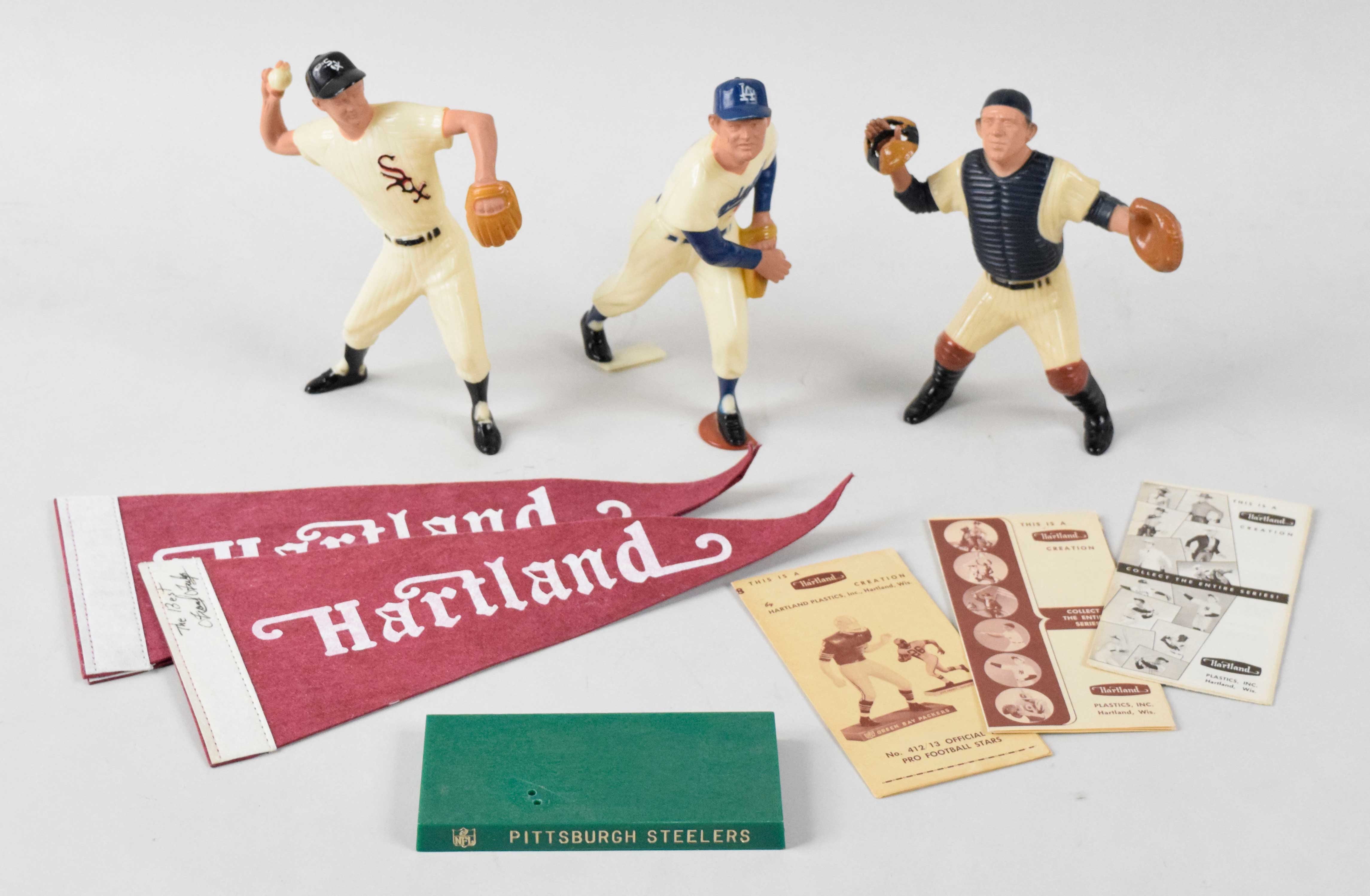 Description:Yogi Berra, Don Drysdale, and Nellie Fox vintage Hartland statues plus Hartland accessories (VG-NM/MT). Includes Yogi Berra with replacement mask (EX/MT), Don Drysdale with purple toe plate variation which is hald cracked off (VG but statue itself EX/MT-NM), Nellie Fox with red trim variation around "SOX" and "2" on back but not on shoulder "2" (EX/MT), (3) vintage Hartland promotional brochures (EX-EX/MT-NM), base for Pittsburgh Steelers statue (NM), (5) black metal plates for magnetic statues, and (3) modern 11.5" mini Hartland pennants (NM-NM/MT one signed by Frank Fulop, supervisor of the assembly and decorating department): VG-NM/MT