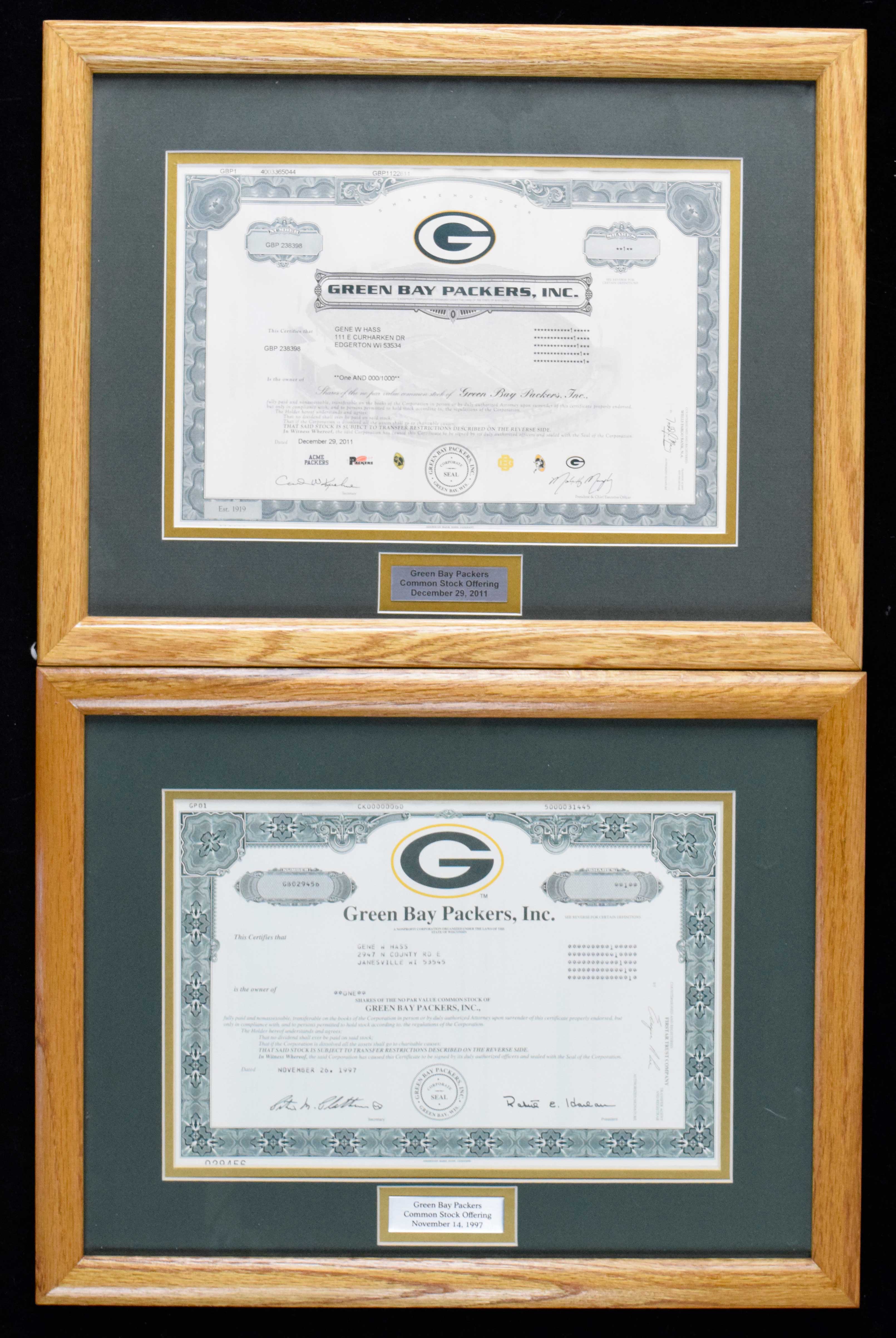 Description:Framed 1997 and 2011 Green Bay Packers stock certificates (NM-NM/MT). Frames measure approx. 14"x17.5". Both were owned by Gene Hass, and have a date placard matted below the certificate. Due to framing, complete conditions are unknown: NM-NM/MT appearance