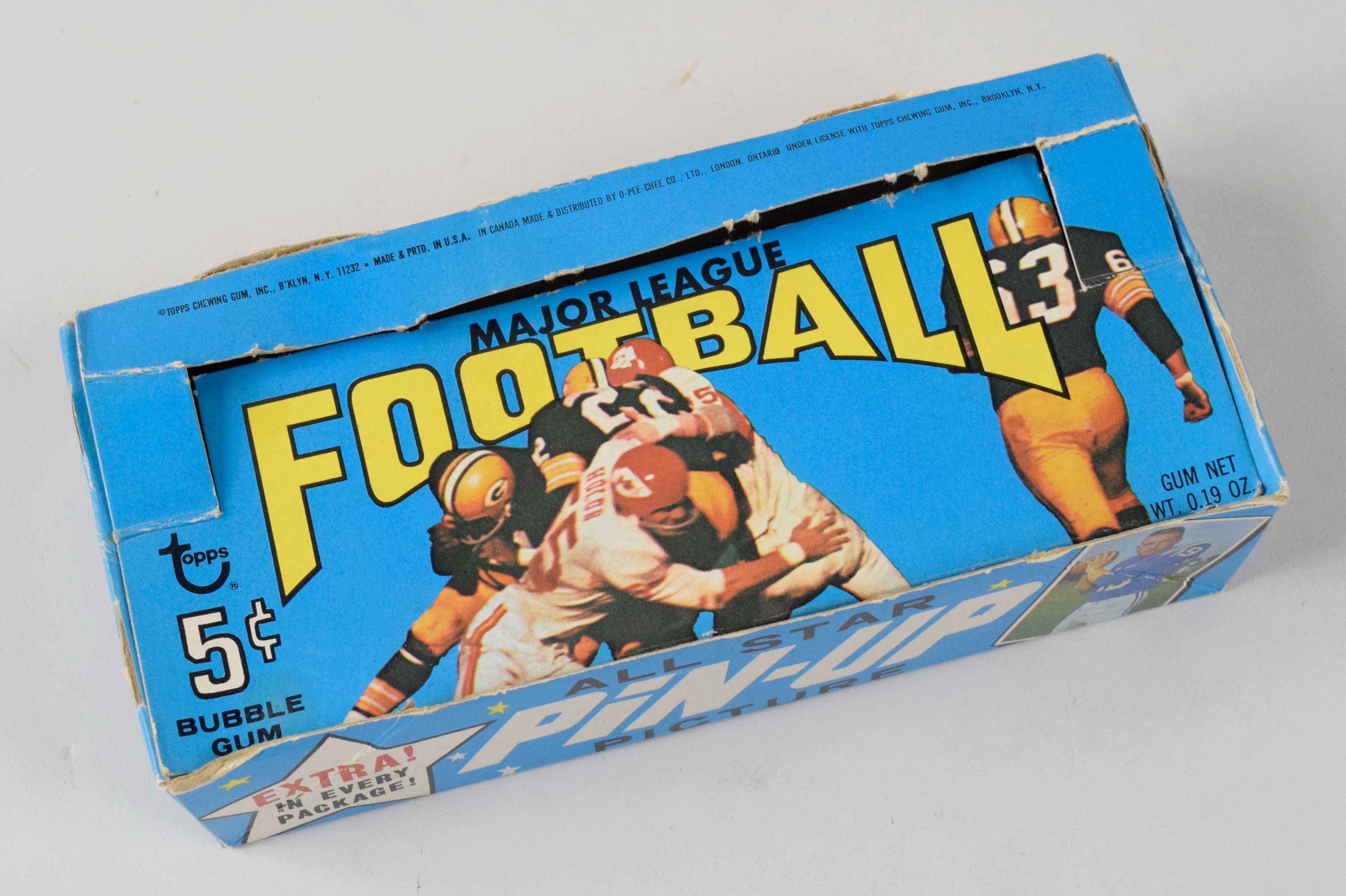 Description:1968 Topps Football empty wax box (EX). Empty 24-count box picturing Johnny Unitas pin-up insert on front side panel. Light wear around the joints, and a minor moisture stain on the back edge: EX