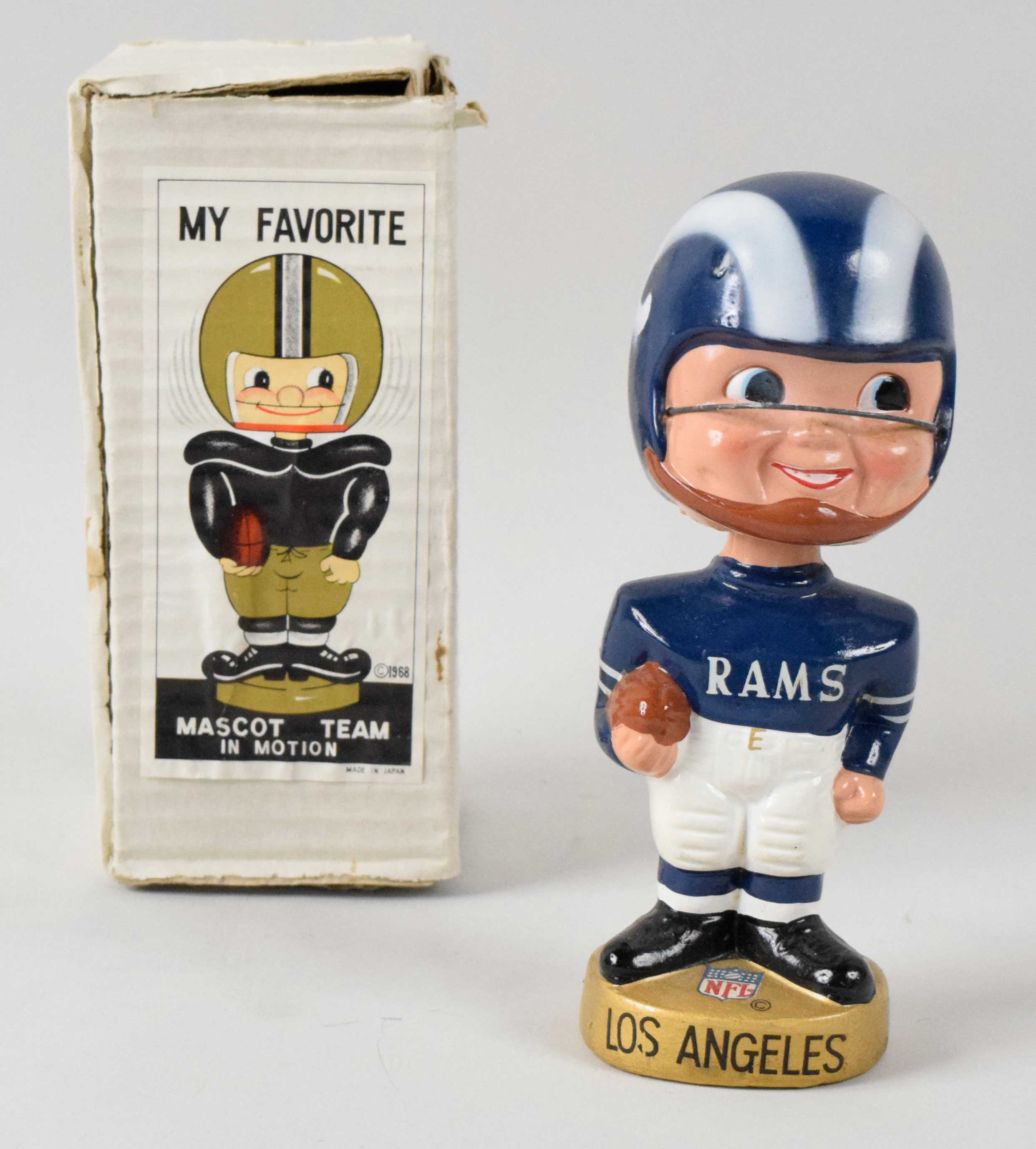 Description:Los Angeles Rams vintage nodder with box, c.1968 (EX/MT-NM). Round gold base Rams nodder with white horns variation from the AFL/NFL Merger Series. Minimal wear with some minor surface residue. Includes original box (stains around staples). Nodder: EX/MT-NM