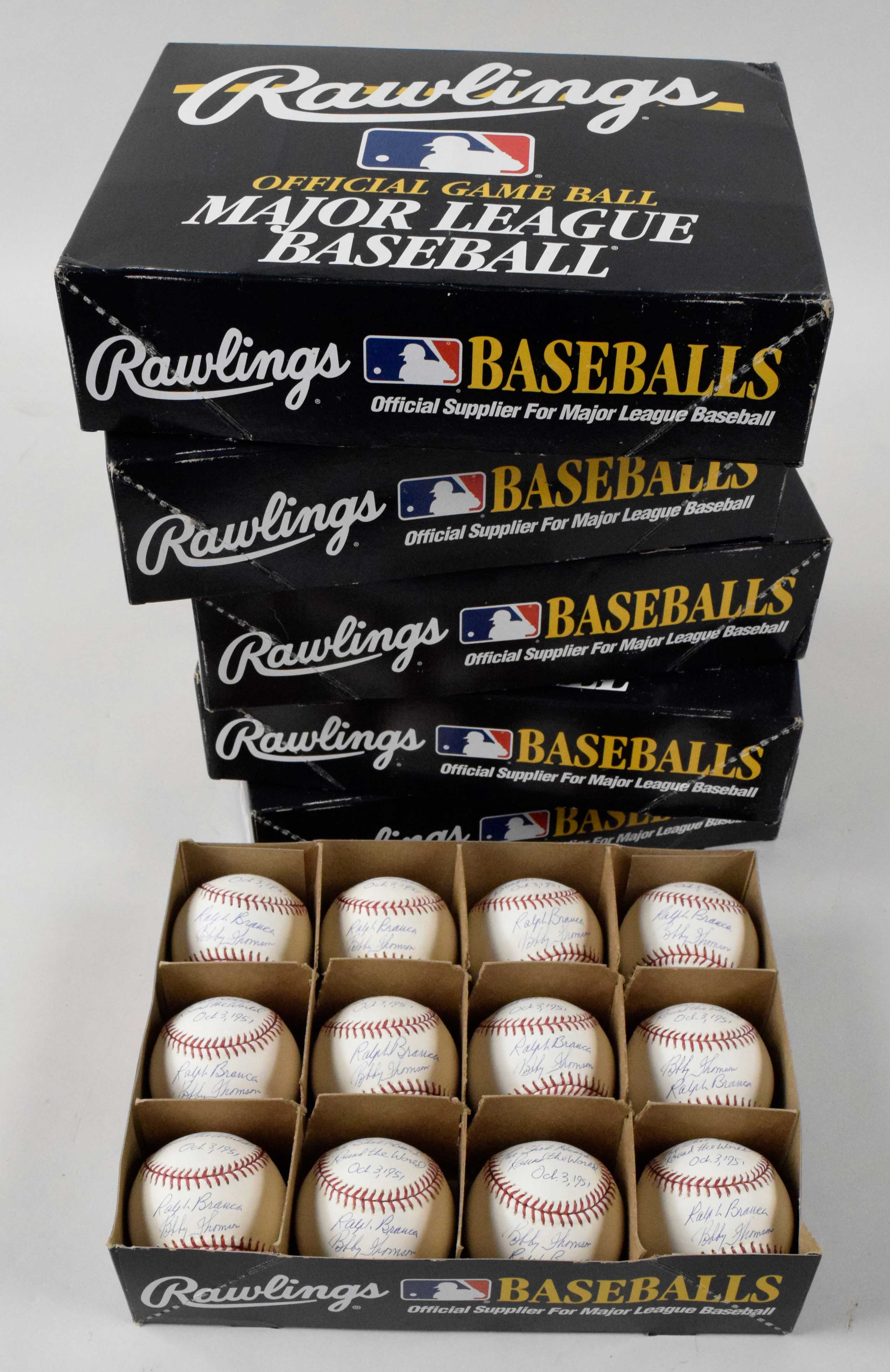 Description:Lot of (72) Bobby Thomson and Ralph Branca dual-signed OML baseballs with "Shot Heard Round The World" inscriptions (EX-NM) Large lot of Rawlings B.Selig OML baseballs which have been signed and inscribed in ink rating an average 8 out of 10 with many better. For the most part balls are near white as issued with some very minor/limited scattered toning possible: EX-NM ($1,500-$3,000)