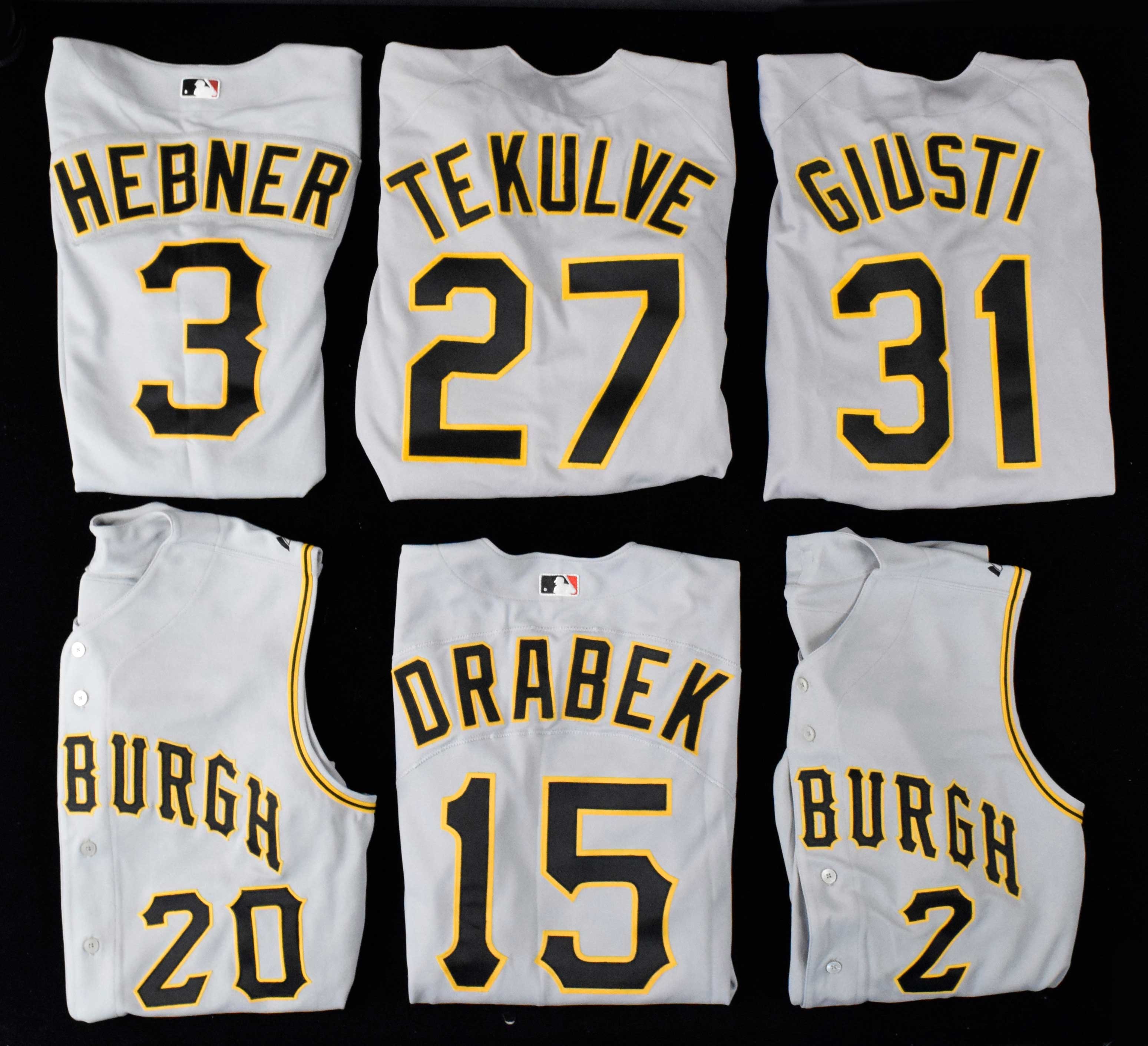 Description:Nice lot of (24) c.1990s-2000s Pittsburgh Pirates team prepared Old-Timers Fantasy Camp jerseys (Overall EX) Nice lot of road gray jerseys which were prepared by the Pittsburgh Pirates for use by Old-Timers who were coaching at Fantasy Camp. A few have "Pirates Camp Brandenton" patch on the sleeve (some are vest style with no sleeves) and all appear to have utilized top quality shells. Most are by Russell Athletic (with Intera flag tag) and size will be noted. If a different manufacturer/type it will be noted after player name. Includes Kent Tekulve (size 44); Grant Jackson (Rawlings, size 48, Set 1 1992 flag tag); Dave Giusti (size 46); Bob Robertson (size 46); Bruce Kison (size 42); Steve Nicosia (size 44); Bill Robinson (Rawlings, size 46, Set 2 1994 flag tag); Milt May (Rawlings, size 46, Set 2 1994 flag tag); Dave Cash (size 42); Gene Alley (size 44); Elroy Face (Rawlings, size 42, Set 1 1993 flag tag); Don Slaught (vest, Rawlings, size 48, 2002 flag tag); Bob Skinner (vest, Majestic, size 48, 2005 flag tag); Frank Thomas (vest, Rawlings, size 50, Set 1 2002 flag tag); Richie Hebner (vest, Majestic, size 48); Doug Drabek (vest, Rawlings, size 46, Set 1 2002 flag tag); Gino Cimoli (vest, Majestic, size 48, 2005 year tag); Bob Oldis (vest, Majestic, size 48, 2005 year tag); Dick Schofield (Majestic, size 42); Rennie Stennett (vest, Majestic, size 48); R.J. Reynolds (vest, Rawlings, size 50, 2002 flag tag); Joe Gibbon (vest, Majestic, size 56); Bob Walk (vest, Rawlings, size 48, Set 1 2002 flag tag); and Hal Smith (vest, Majestic, size 48, 2005 flag tag). Varying degrees of use/wear throughout: Overall EX ($2,000-$3,000)