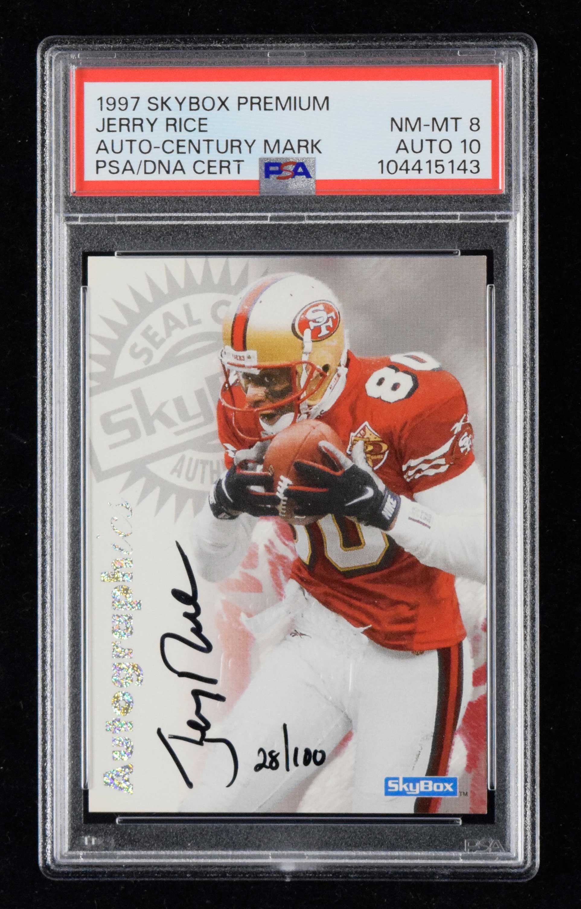 Description:Highest graded 1997 Skybox Premium Autographics Century Marks Jerry Rice auto (28/100) (PSA NM-MT 8 with 10 autograph) Rare insert numbered "28/100" with PSA 10 graded autograph: PSA NM-MT 8 with 10 autograph ($500-$1,000)