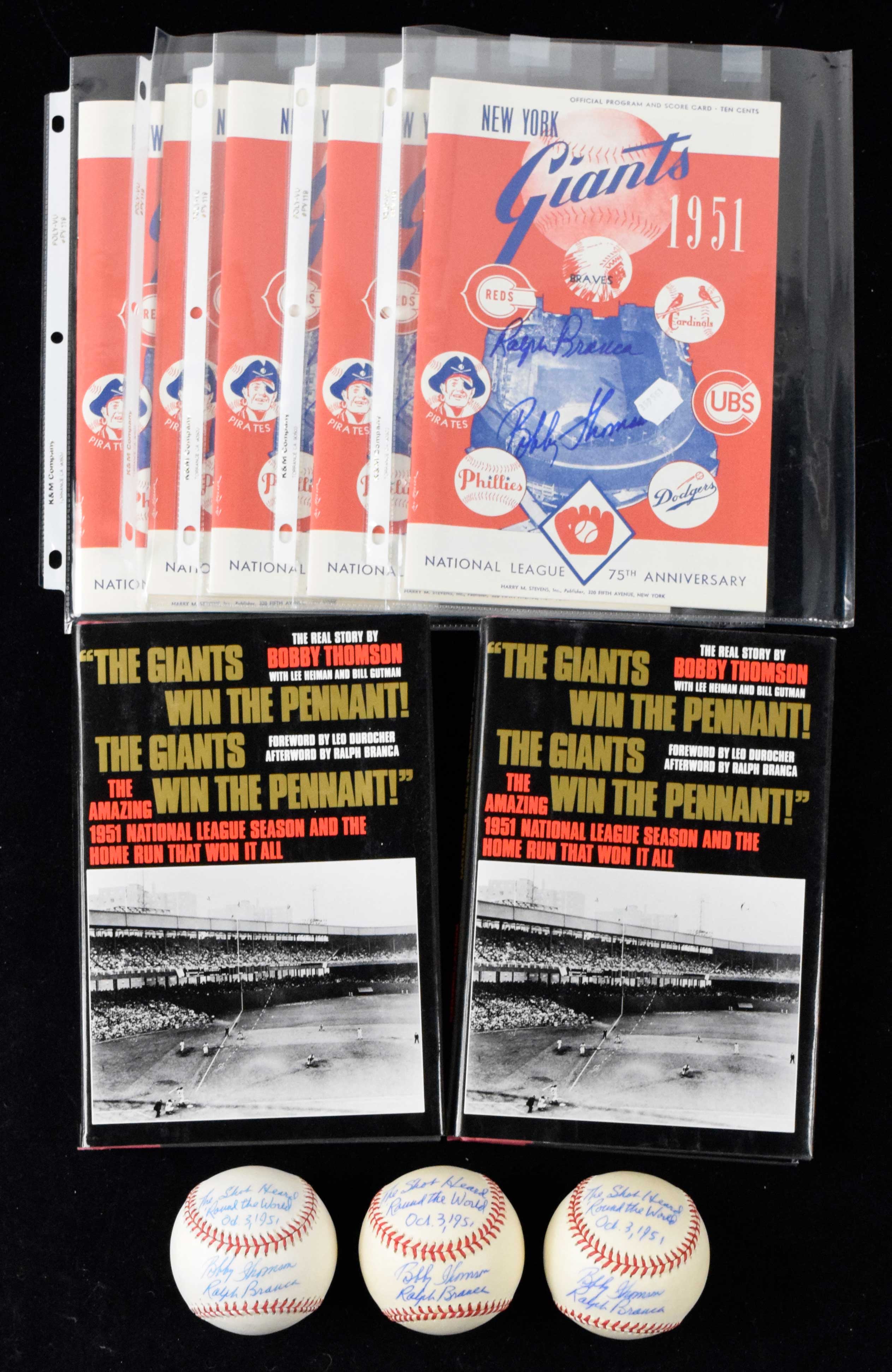 Description:Lot of (30) Bobby Thomson and/or Ralph Branca autographed pieces (VG-NM) Includes (5) Bobby Thomson and Ralph Branca autographed Rawlings L.Coleman ONL balls with home run related inscription (balls toned, signatures average 7-7/8 out of 10); (5) Bobby Thomson and Ralph Branca autographed reproduction Shot Heard Round the World scorecards; (5) Bobby Thomson autographed "Giants Win The Pennant" hardcover books; (15) 2001 issues of the Wall Street Journal which have a front cover article about the 1951 World Series, each has been signed by Ralph Branca (touch of light handling wear to papers): VG-NM