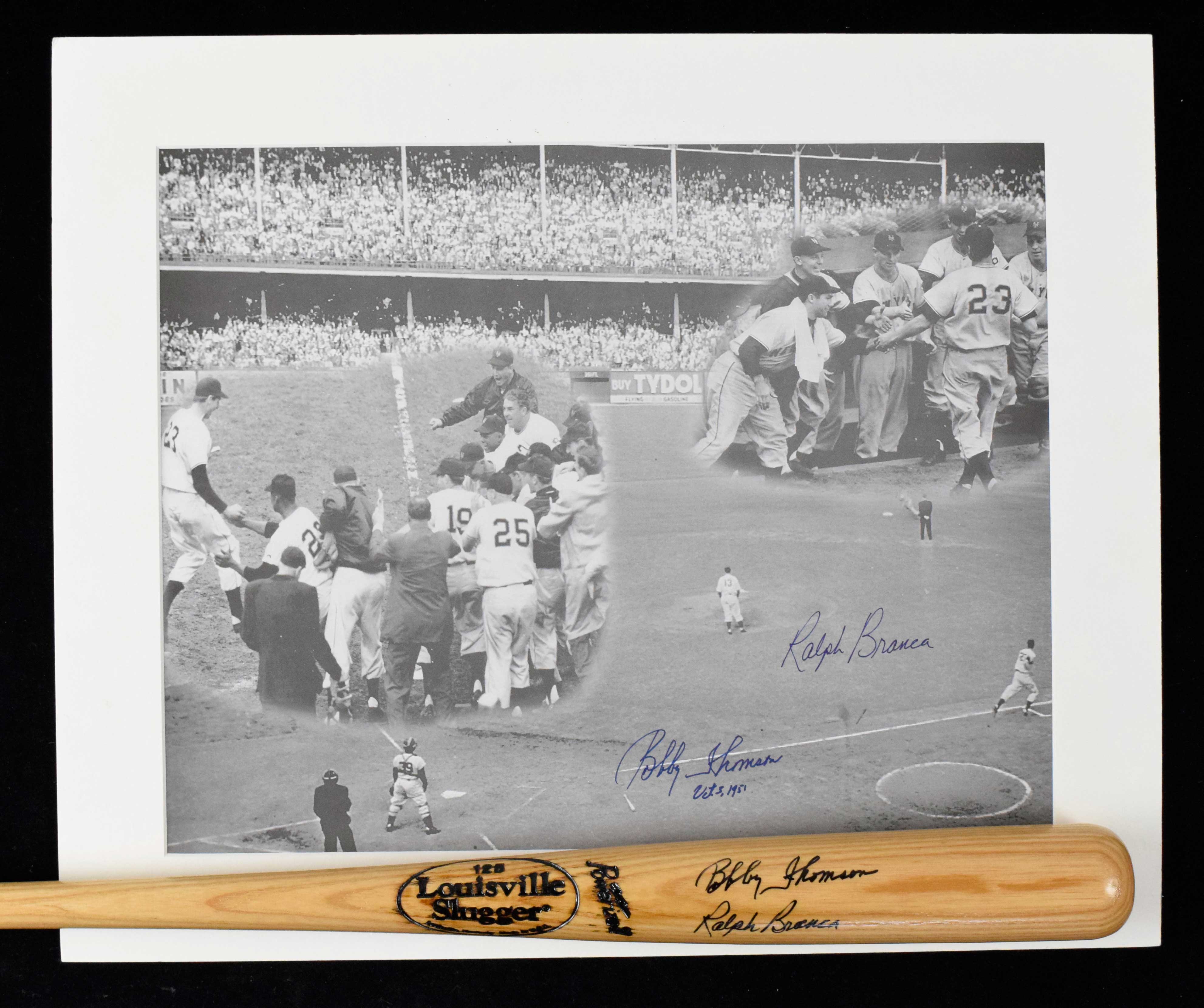 Description:Bobby Thomas and Ralph Branca autographed bat and oversized image (NM) Louisville Slugger bat has been signed by both in marker rating 8-8/9 out of 10; black and white print matted to 20"x24" (will need to ship flat) has likewise been autographed: NM