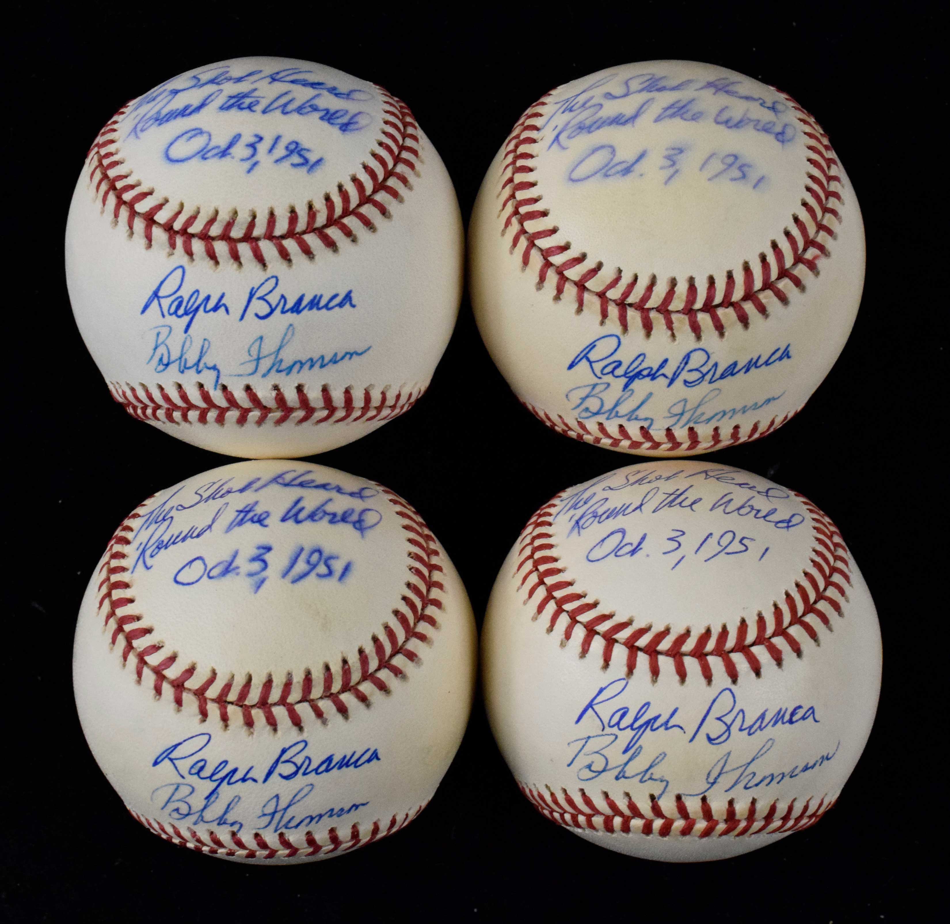 Description:Lot of (12) Bobby Thomson and Ralph Branca dual-signed baseballs (VG-EX/MT) Rawlings Official National League baseballs have been signed in in ink rating 6 to 8 out of 10. Each has light to moderate toning: VG-EX/MT
