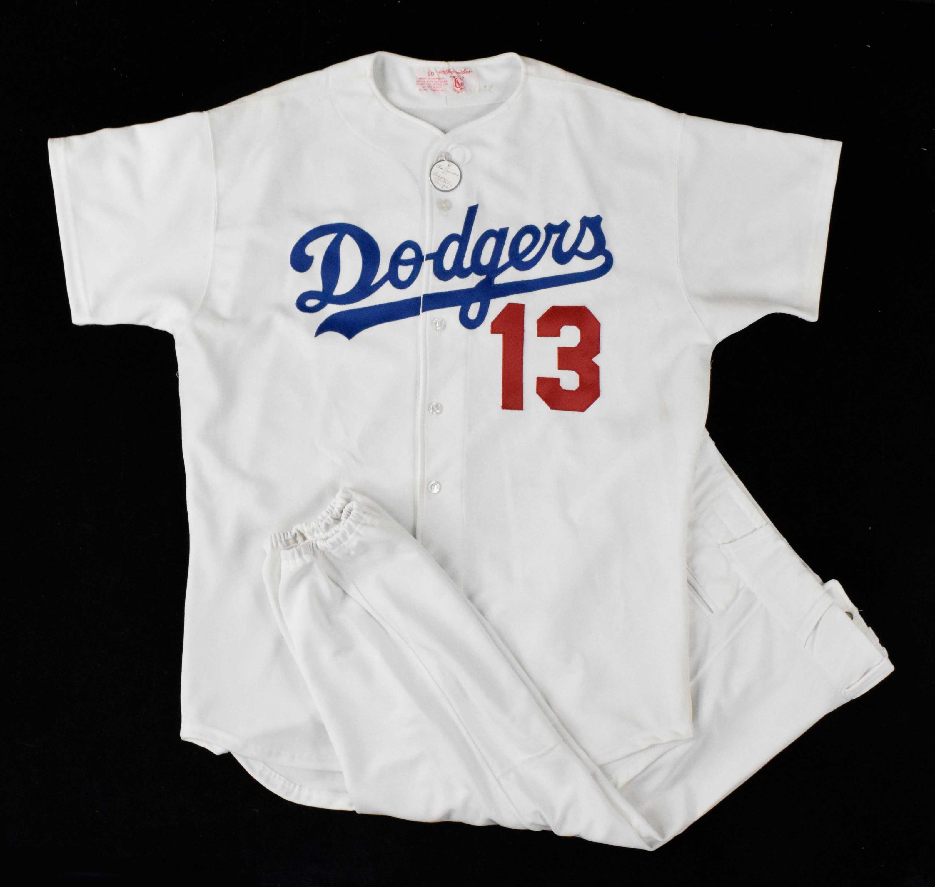 Description:Ralph Branca's Los Angeles Dodgers Old-Timers and Fantasy Camp jersey and pants (EX) Jersey and pants are of professional quality and appear to have been issued by the Dodgers. From the collection of Ralph Branca and used by him during team related Old-Timers events and Fantasy Camps. Team name across the front with number "13" below. Number is also on the back below the name "Branca". Goodman & Sons tag in the collar with similar tag in the pants (pants size 44, jersey size 50). Use and wash wear: EX
