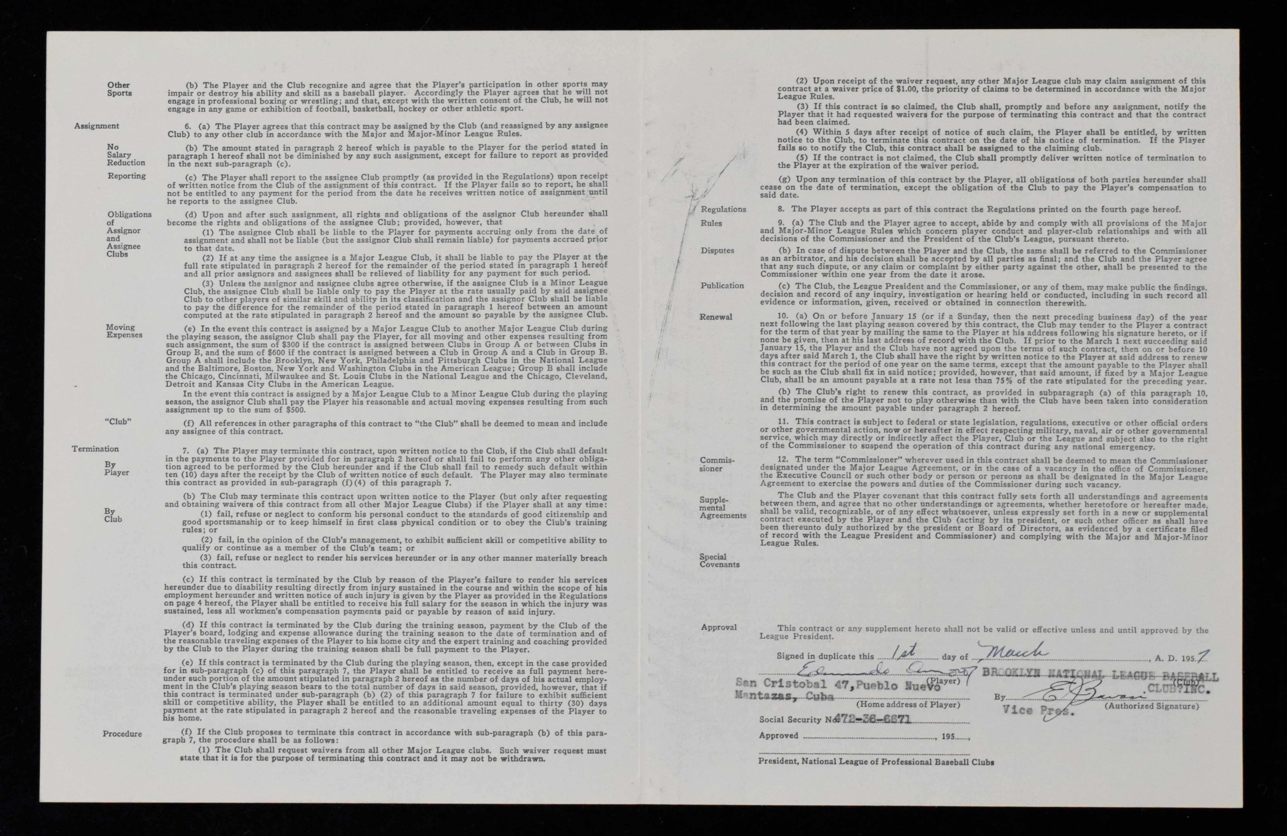 Description:1957 Sandy Amoros Brooklyn Dodgers Player's Contract (full JSA LOA) (EX) Uniform Player's Contract has been signed on the inside by Amoros and Buzzy Bavasi. Ink signatures rate 8 to 8/9 out of 10. Mild handling and storage wear with some scattered streaks of discoloration. Includes full LOA from JSA: EX