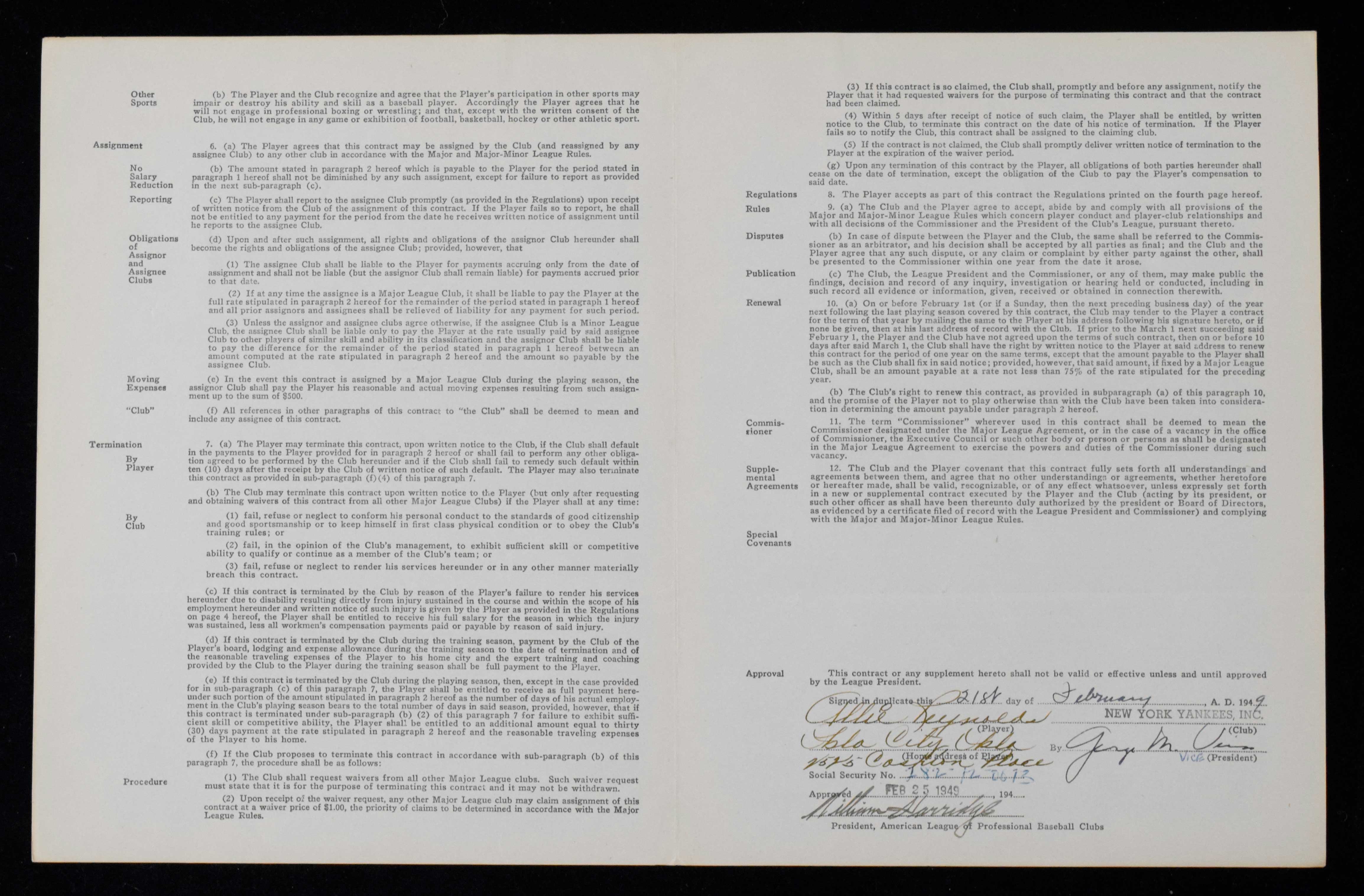 Description:1949 Allie Reynolds New York Yankees contract - signed by Reynolds, Harridge, and Weiss - Championship season (EX) Uniform Player's Contract covering his services for the 1949 season (an historic one for the Yankees) has been signed inside by both Allie Reynolds, William Harridge, and George Weiss. Signatures rate 8 to 9 out of 10. Light toning and some typical handling and storage wear and there are a few rust spots: EX