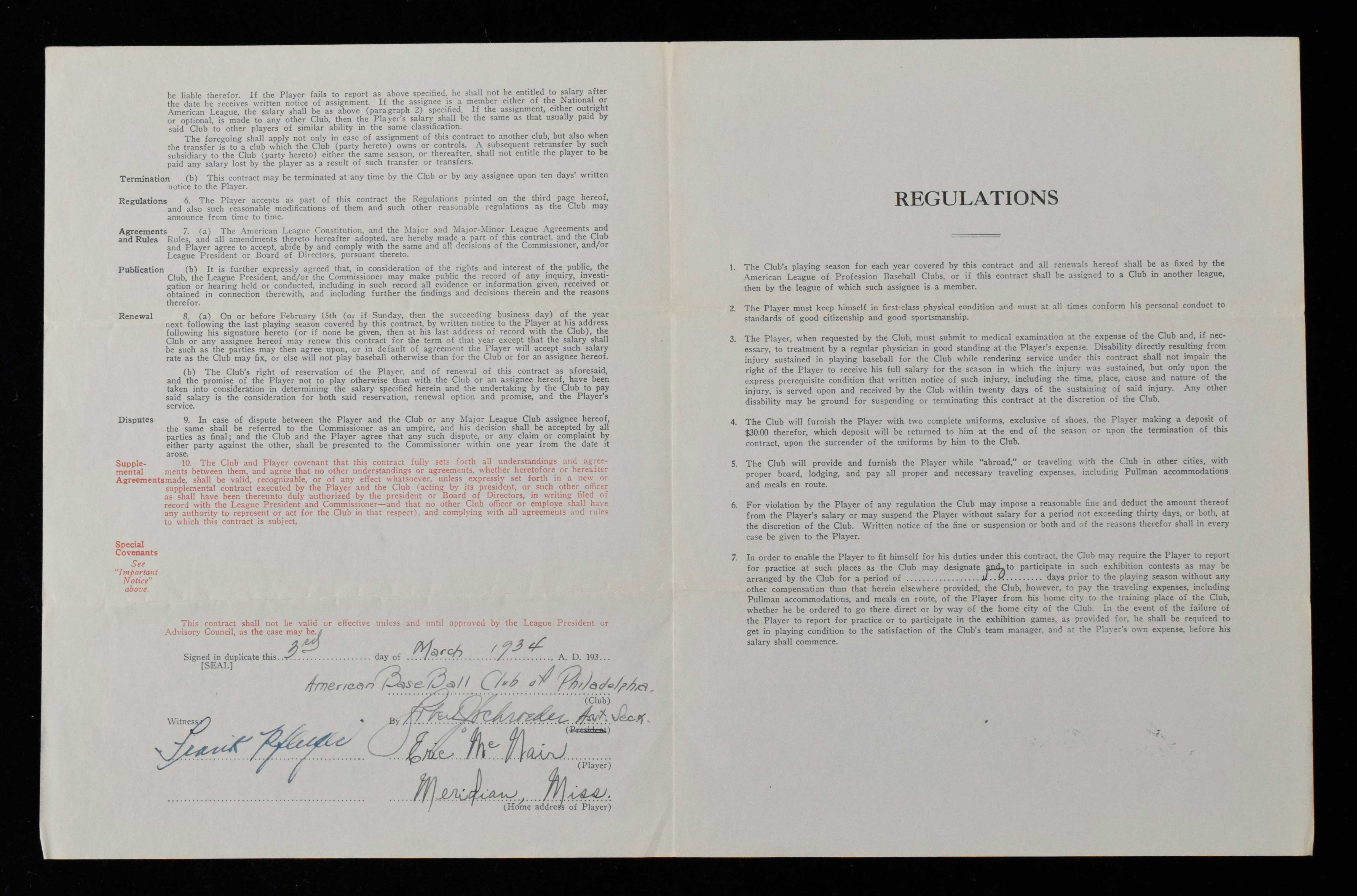 Description:1934 Eric McNair Philadelphia Athletics Player's Contract (EX) Uniform Player's Contract covering his services for the 1934 season has been signed inside by McNair, Frank Pfeffer (as witness), and a team representative. Toning and some general handling and storage wear with typical fold lines: EX
