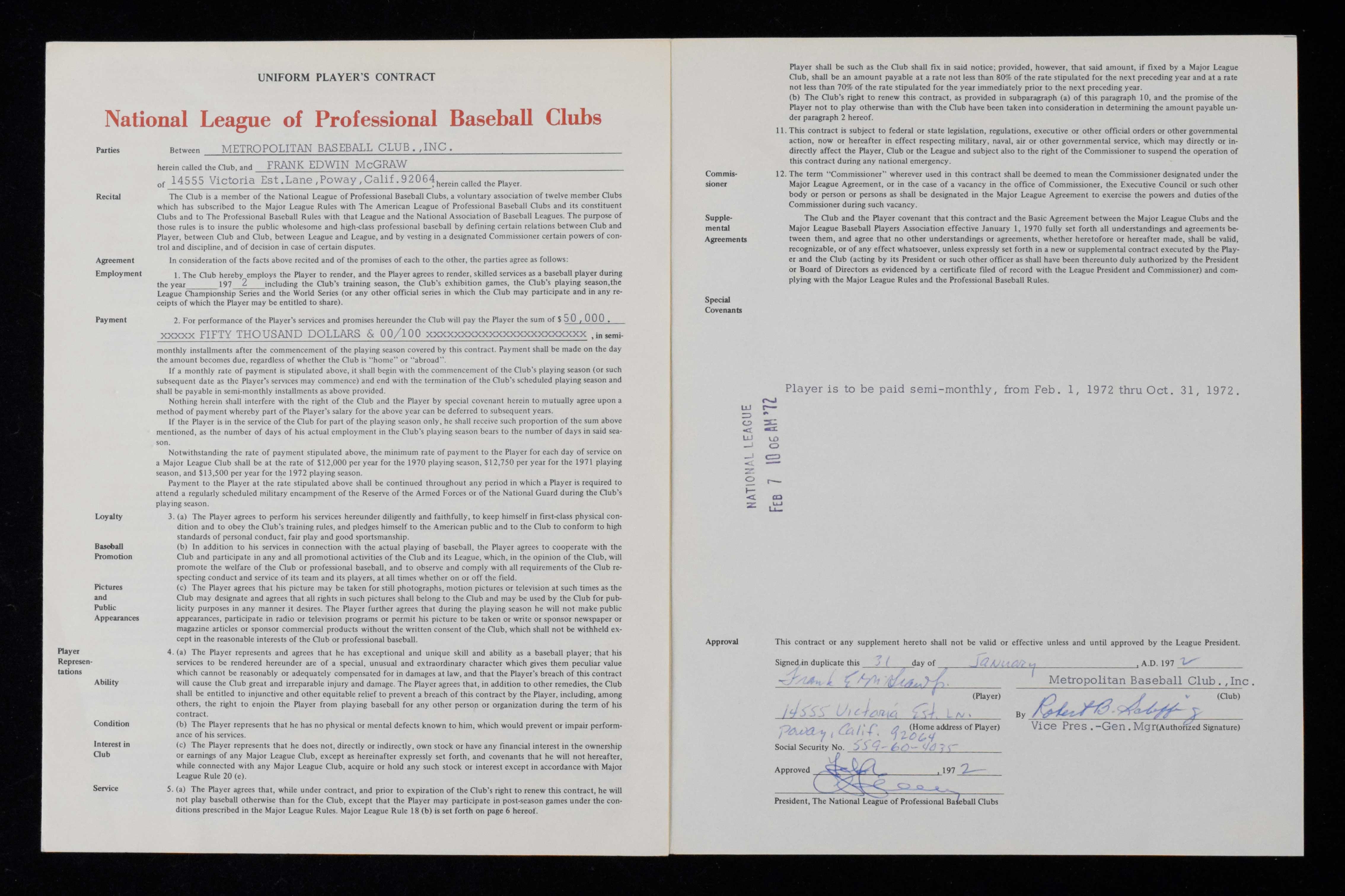 Description:1972 Tug McGraw New York Mets Player's Contract (EX/MT) Uniform Player's Contract covering his services for the 1972 season has been signed inside by McGraw (with his given name - Frank E. McGraw Jr) along with Bob Scheffing and Chub Feeney. Signatures rate 8-8/9 out of 10. Light/mild wear: EX/MT