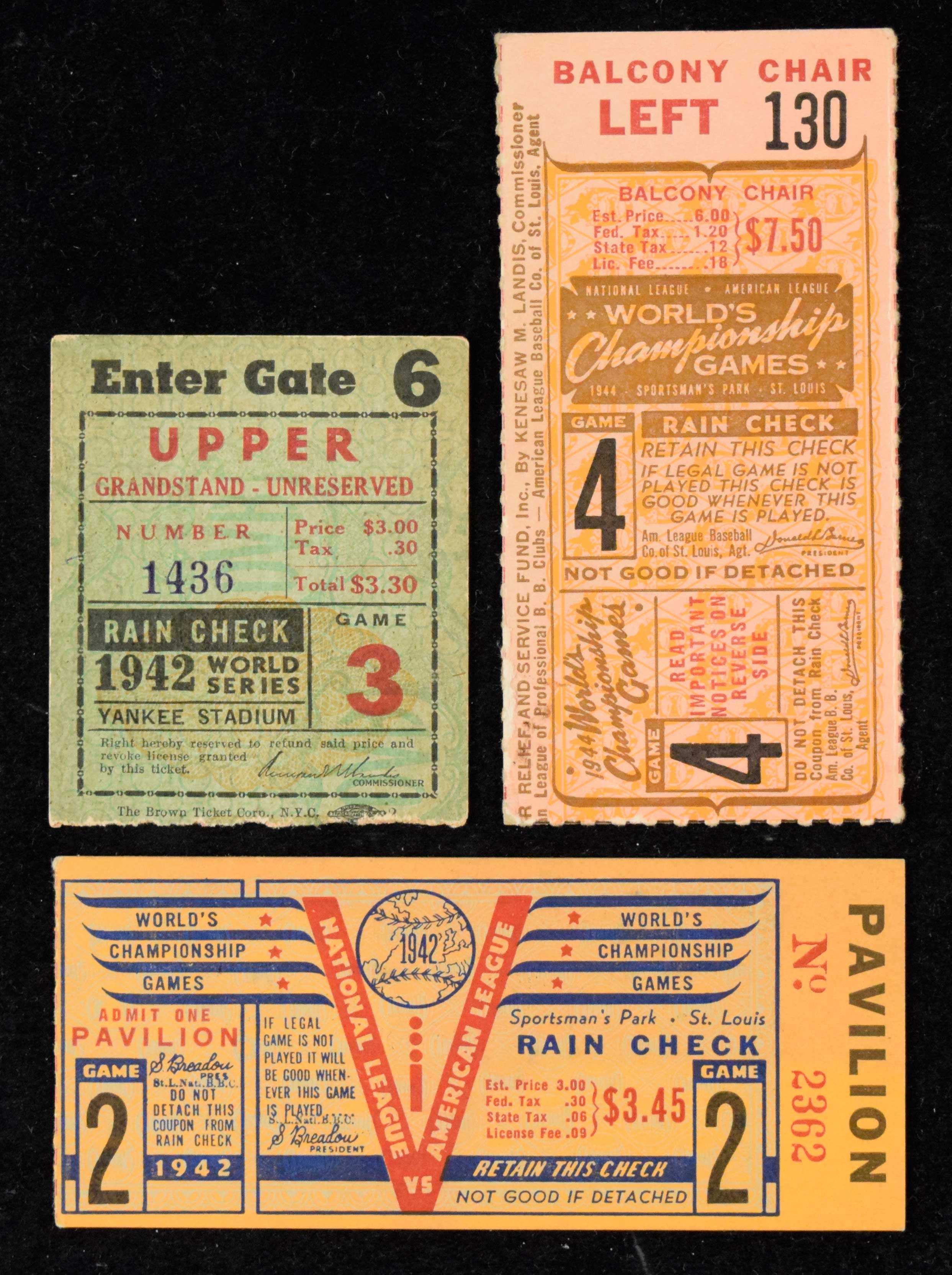 Description:1942 World Series (Games 2 and 3) and 1944 World Series (Game 4) ticket stubs (3) Includes 1942 Game (2) (GD - displays EX/MT); 1942 Game (3) (VG/EX-EX); 1944 Game (4) (EX-EX/MT): GD-EX