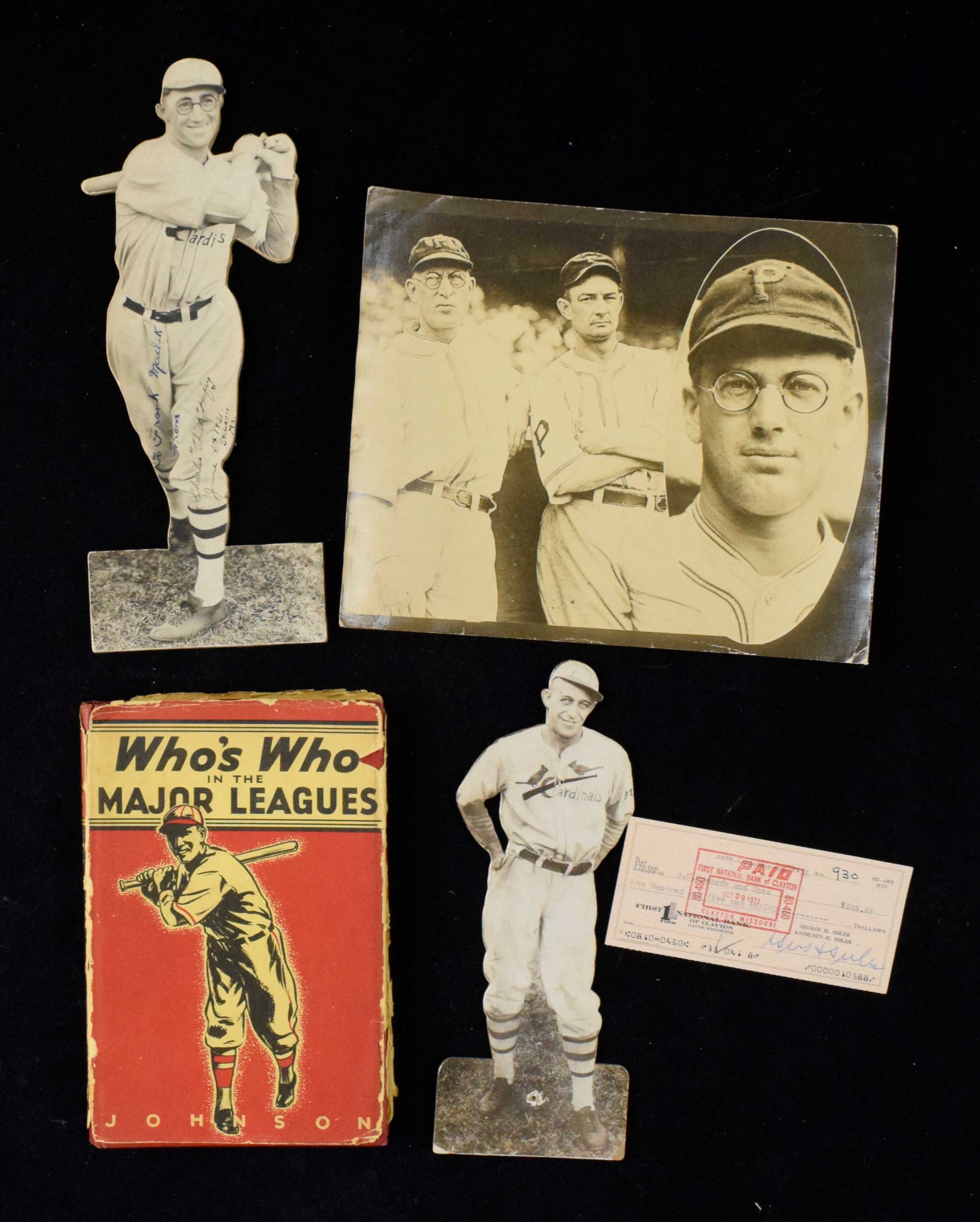 Description:Nice lot of vintage baseball pieces including Chick Hafey and George Sisler autographs (GD-EX) Includes 1935 Who' Who in Baseball hardcover book with Speed Johnson signature on the first inside page inscribed "To Rip" (our consignor has relayed that this is Rip Collins); 1971 George Sisler signed personal check; c.1930s 12" tall cutout of a vintage photo (mounted to backing) of Chick Hafey which he has signed and dated (1931) in fountain pen rating 7/8 out of 10. A personalization above was written by someone else; smaller unsigned c.1930s cutout of Jim Bottomley; vintage c.1920s composite 9"x11" satin finish photo showing Fred Clarke, Bill McKechnie, and Lee Meadows. Varying degrees/types of wear throughout: GD-EX