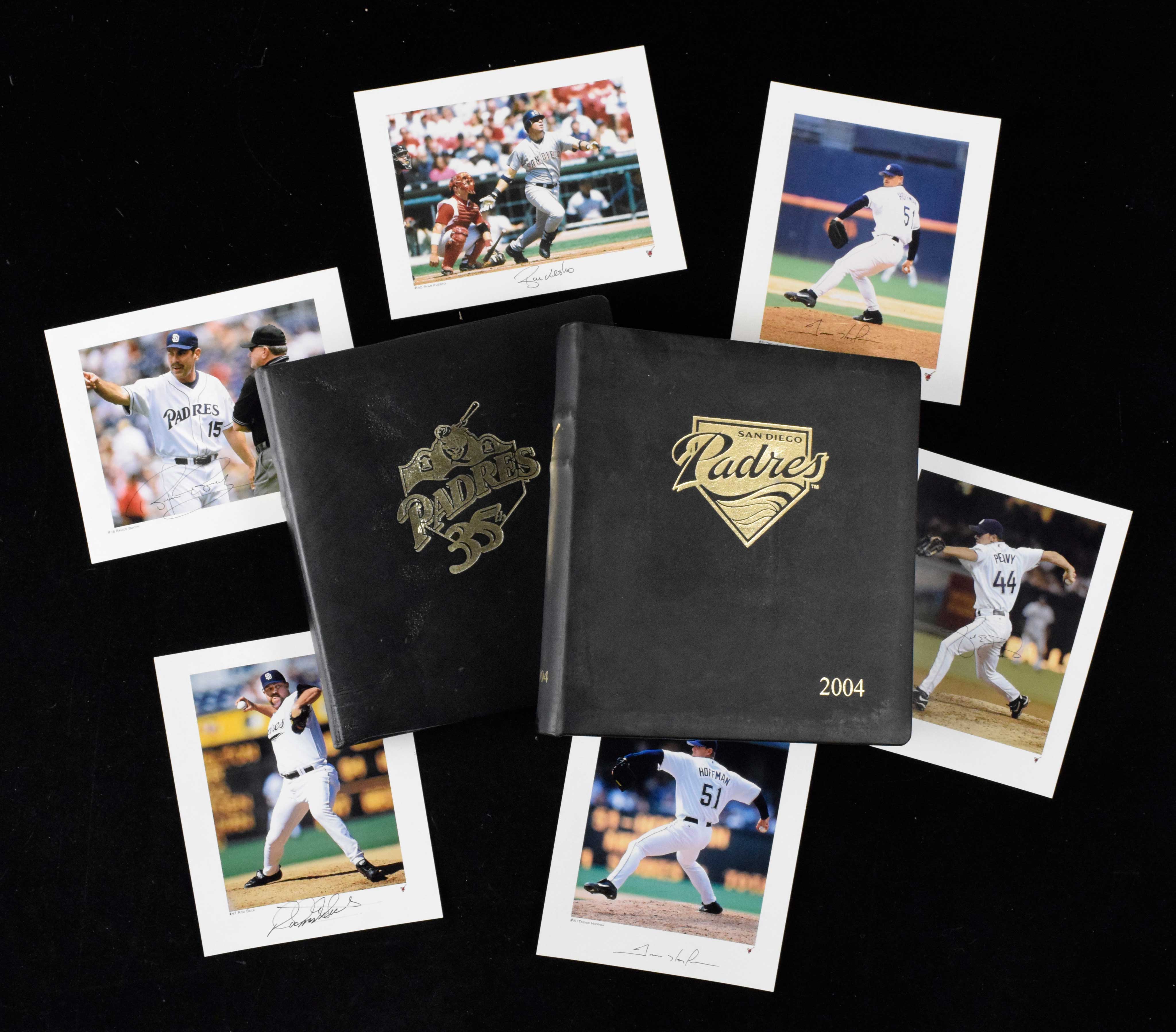 Description:2003 and 2004 San Diego Padres team issued sets of autographed 8"x10" photos (custom cases) (85 total sigs) (EX-NM) Includes sets of 2003 and 2004 San Diego Padres player signed 8"x10" photographs. Each group contains signed pieces that were compiled by the team and there are individual custom 12"x12.5"x2" book style holders which have impressed logo and year on the front and binding. These were presumably done in very limited numbers and likely only given to team members and select front office personelle. The 2003 set includes (40) with Trevor Hoffman, Bruce Bochy, Brian Giles, Rod Beck, Sean Burroughs, Ryan Klesko, Adam Eaton, Mark Kotsay, Jake Peavy, Phil Nevin, Davy Lopes, and others; the 2004 contains (45) with Hoffman, Beck, Wells, Peavy, Giles, Aurila, Nevin, Loretta, Lopes, Burroughs, Klesko, and Bochy. Signatures rate 8 out of 10 or better with (1) or (2) exceptions. Books/holders have some wear: EX-NM
