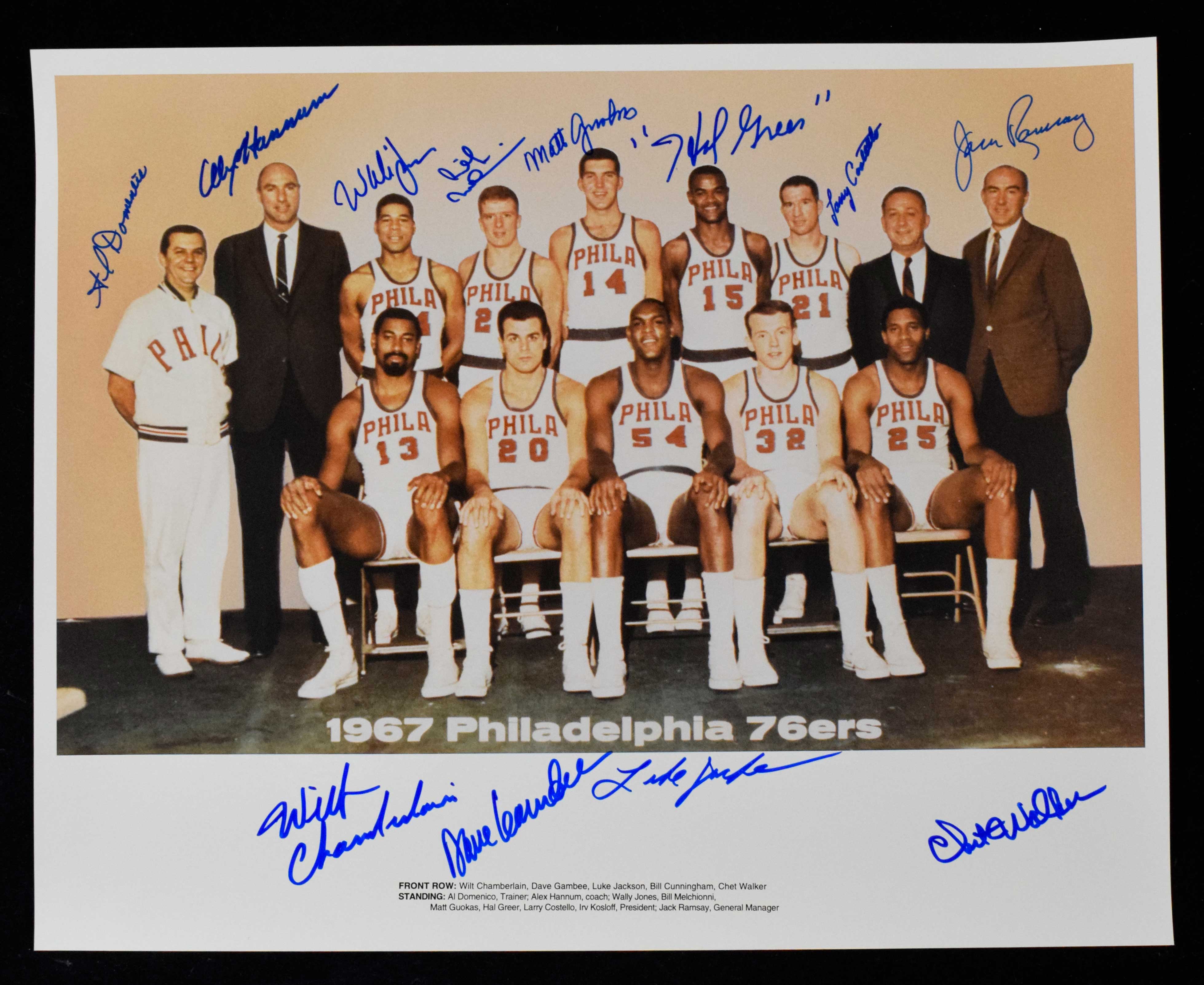 Description:1967 Philadelphia 76ers team signed 16"x20" photograph with Wilt Chamberlain (NM) Color photo has been signed by (12) incl. Chamberlain, Hal Greer, Jack Ramsey, Chet Walker, Alex Hannum, Wally Jones, Larry Costello, and others. Marker signatures rate 9 to 9/10 out of 10: NM ($1,000-$1,500)