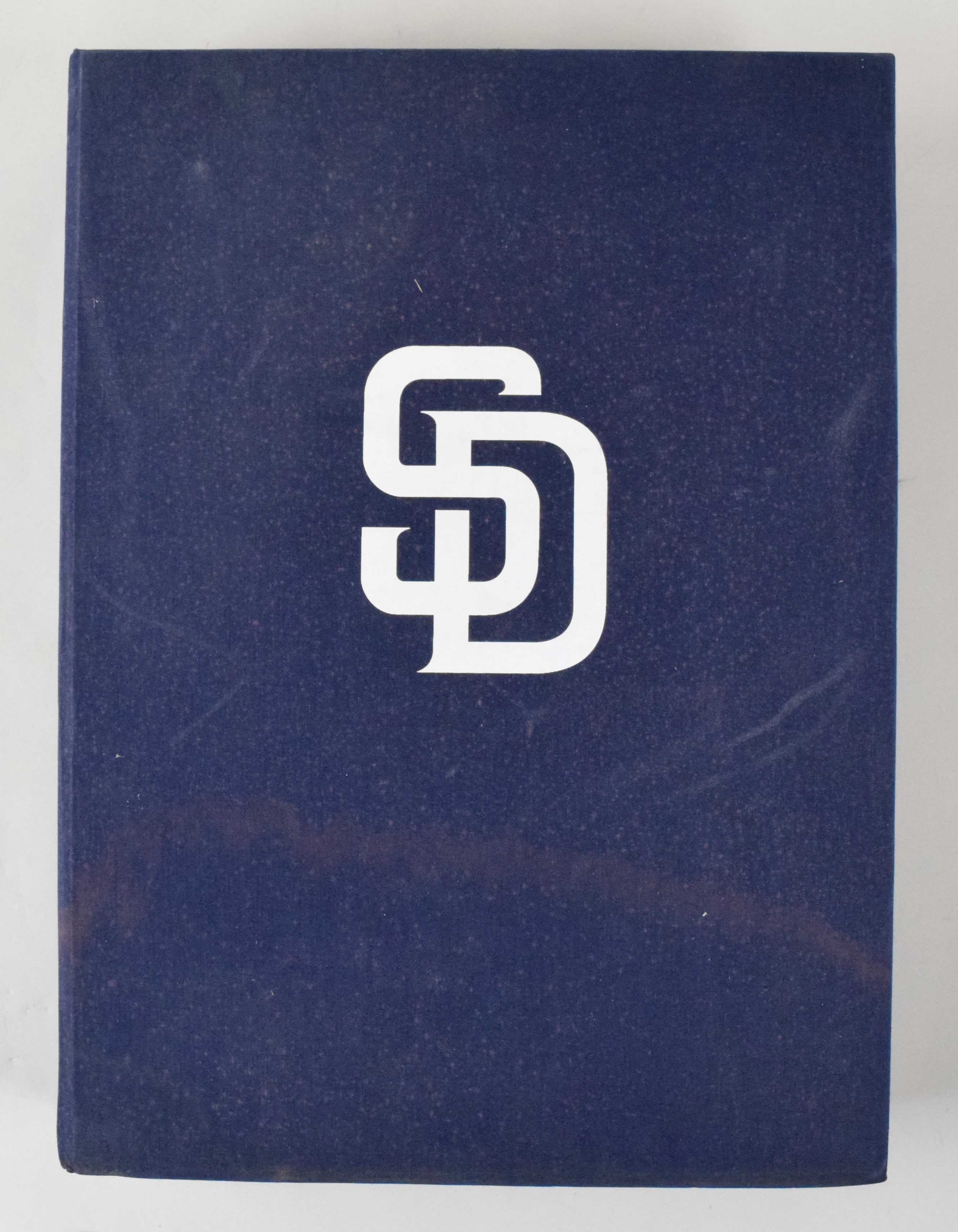 Description:"Major League Baseball Opus" - Padres edition signed by Gwynn, Winfield, and Hoffman (Sigs. NM, Book EX/MT-NM, Case EX) Massive photographic history of baseball comes in a custom 20"x15"x4" box/cover. It appears to have been a special edition issued for the San Diego Padres with the team logo on both the case and front cover. This is the higher end version which is bound in white faux leather. Signed on the first inside page by Tony Gwynn, Dave Winfield, and Trevor Hoffman in marker rating 8/9 out of 10. The case/cover has soiling/spotting throughout. Book has a hint of light wear: Sigs. NM, Book EX/MT-NM, Case EX