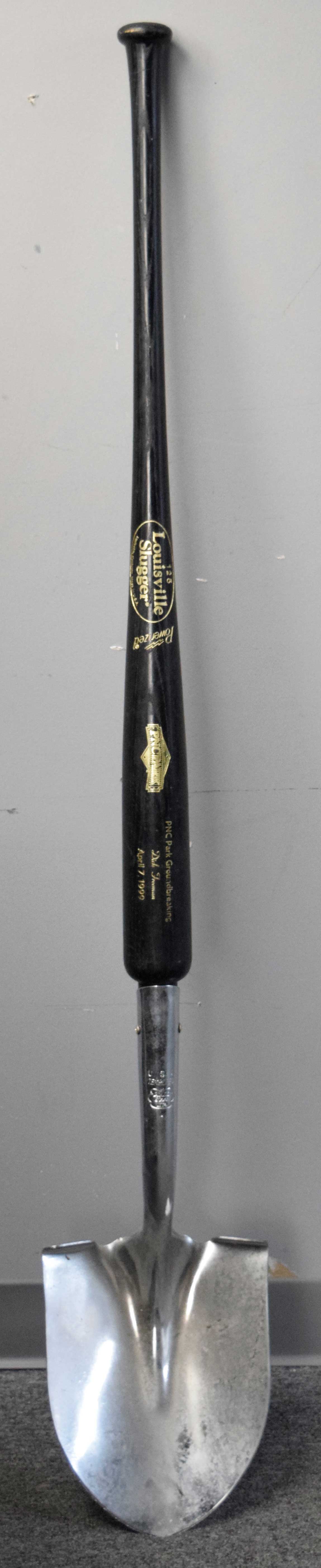 Description:April 7, 1999 PNC Park (Pittsburgh Pirates) groundbreaking shovel (EX/MT) Commemorative shovel done for the groundbreaking ceremony for PNC Park in Pittsburgh. Presumably intended to have been used and there is a touch of light scattered wear (unclear if this is from use or storage). Very nice display piece with the handle done by Louisville Slugger: EX/MT