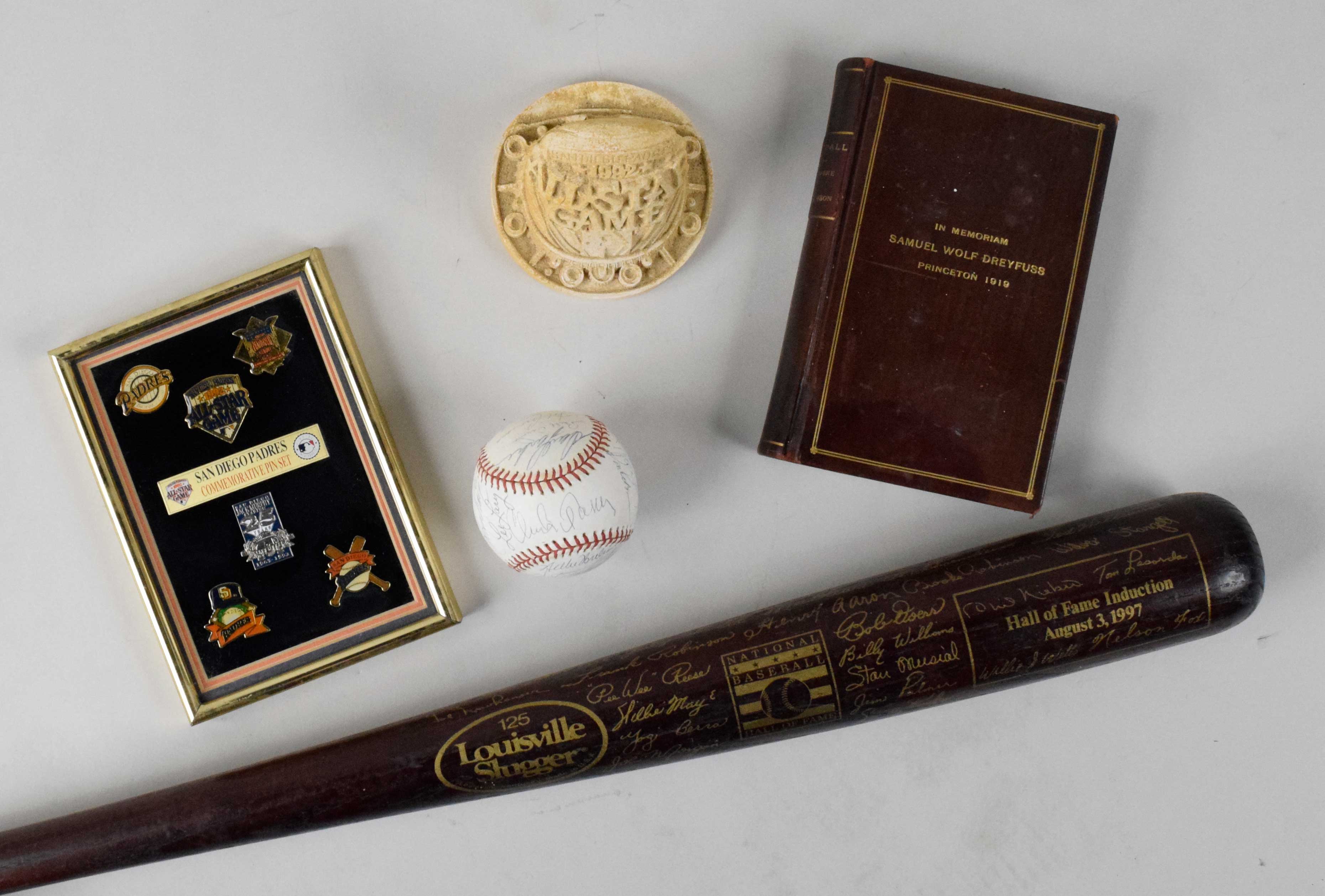Description:Lot of (5) baseball related pieces incl. 1997 Dignitary HOF bat and 1915 leather bound book (VG-EX/MT) Includes 1997 Baseball Hall of Fame Induction commemorative brown bat - dignitary edition which has facsimile signatures/names of all Inductees (regular version features only the then current year Inductees) (light wear); Rawlings L.Coleman ONL signed by (22) former Pirates players incl. Bill Mazeroski, Chuck Tanner, Dave Parker, Kent Tekulve, Steve Blass, and Bill Madlock. Signatures rate 6/7 to 7 out of 10, ball is a touch off white; 1992 All-Star Game commemorative piece; small 5"x7" frame with 1992 All-Star Game related pins inside; leather bound gilt lettered early edition of "Baseball" by Clarke and Dawson (1915 copyright date) (EX): VG-EX/MT