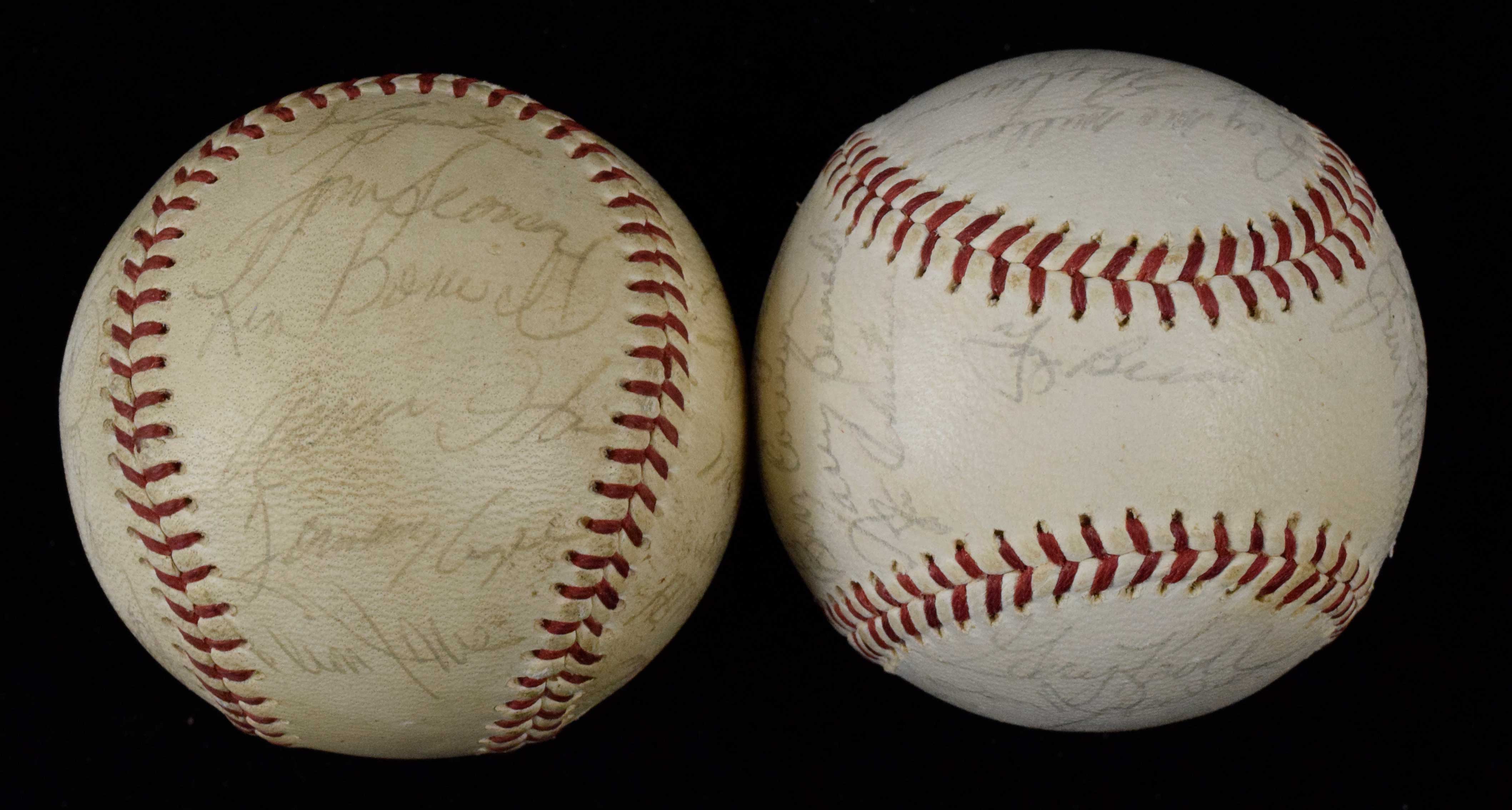 Description:1965 and 1969 New York Mets team signed baseballs (VG-EX) Includes 1965 Mets on Spalding W.Giles ONL ball - (22) signatures including Yogi Berra, Ed Kranepool, Tug McGraw, Warren Spahn, Wes Westrum, Jack Fischer, and Ron Swoboda. All done in ink rating 6-6/7 out of 10, ball has light even toning; 1969 Mets on Giles ball - (23) signatures including Berra, Tom Seaver, Ed Charles, Jerry Koosman, Ron Swoboda, Cal Koonce, Ed Kranepool, Tug McGraw, Cleon Jones, and Tommie Agee. Signatures rate 6/7 to 7 out of 10, ball has some toning/soiling: VG-EX