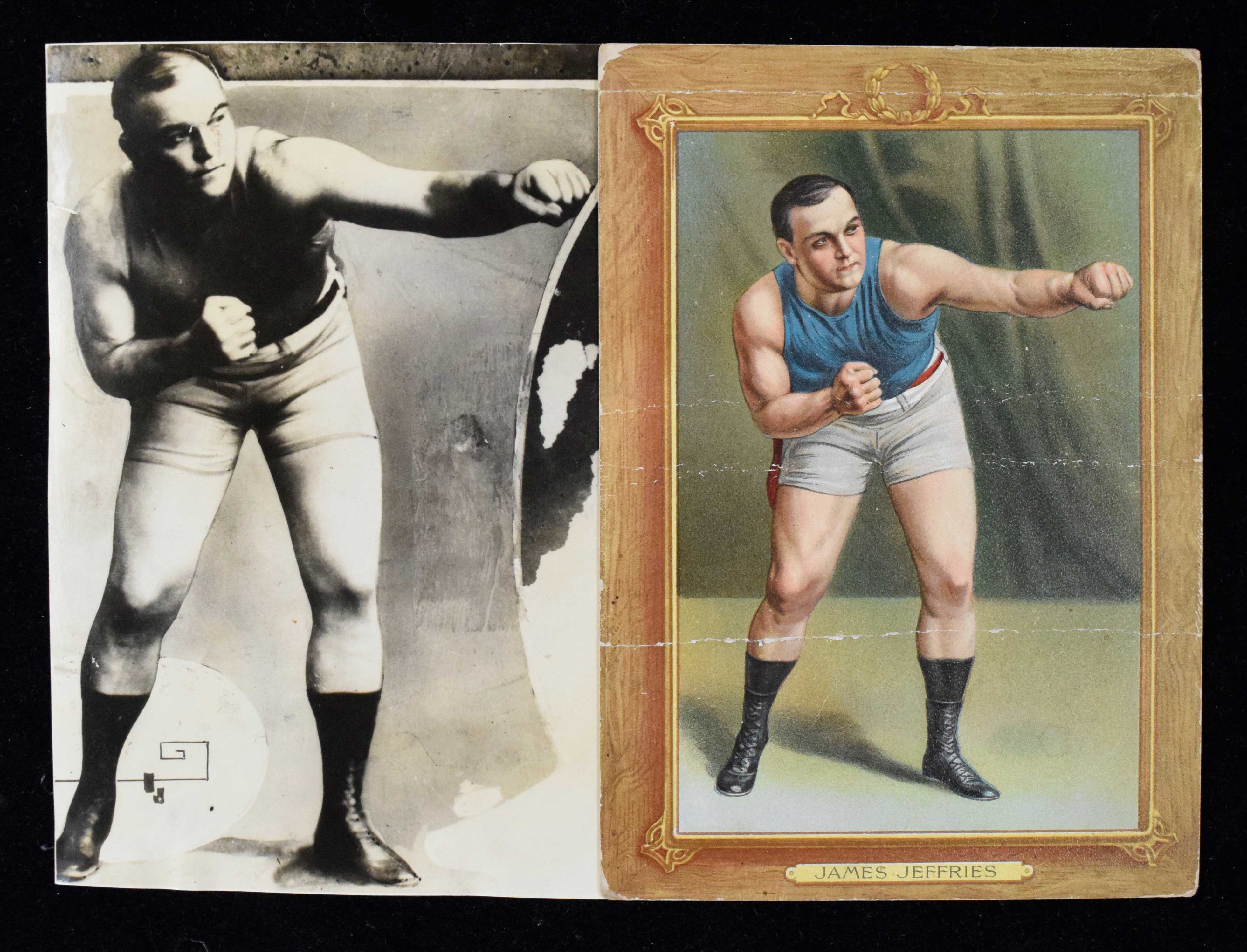 Description:1910 T9 Turkey Red Jim Jeffries (PR) with matching news service photograph (GD/VG) Original T9 Turkey Red with creasing and some other wear and there are pencil marks/notations on back. Includes a 5.5"x8" sepia toned image of Jeffries in the same pose as is shown on the Turkey Red. Photo has some moderate toning and light wear. There is a news service stamp on the back along with some discoloration: PR and GD/VG