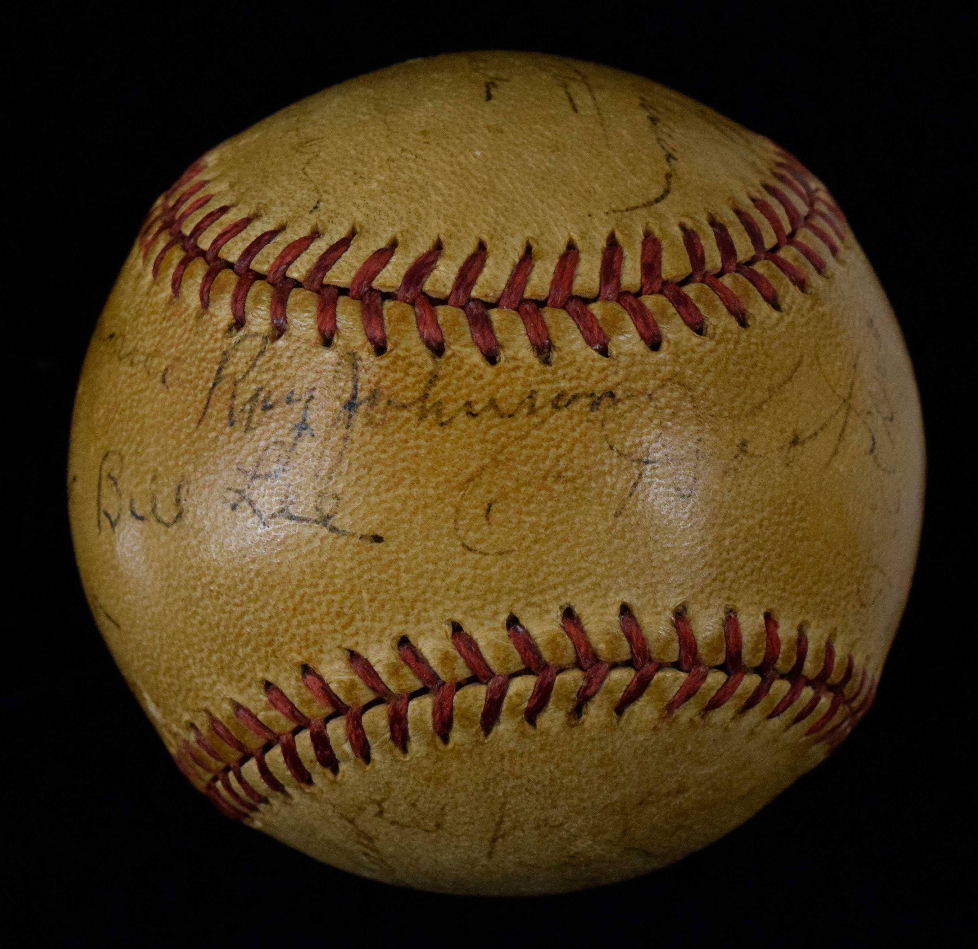Description:1936 Chicago Cubs team signed baseball with Chuck Klein (JSA) (VG) Spalding F.Frick Official National League baseball has been signed by (21) incl. Chuck Klein, Billy Herman, Fred Lindstrom, Phil Cavaretta, Stan Hack, Charlie Grimm, Charlie Root, Lon Warneke, and others. Fountain pen signatures rate 4 to 7 out of 10 with a good number falling at levels within that range. Toned throughout. Includes full LOA from JSA: VG