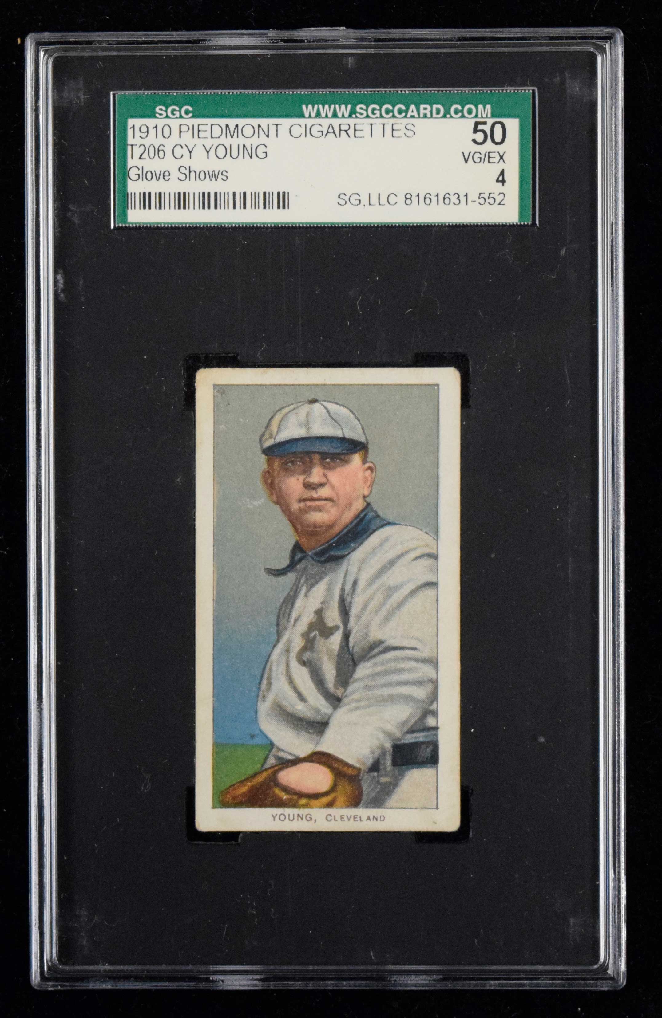Description:1909-11 T206 Piedmont Cy Young (Glove shows) (SGC 4 VG/EX) Key card is reasonably well centered with some light corner wear. A few flaws to holder itself: SGC 4 VG/EX ($1,500-$2,500)
