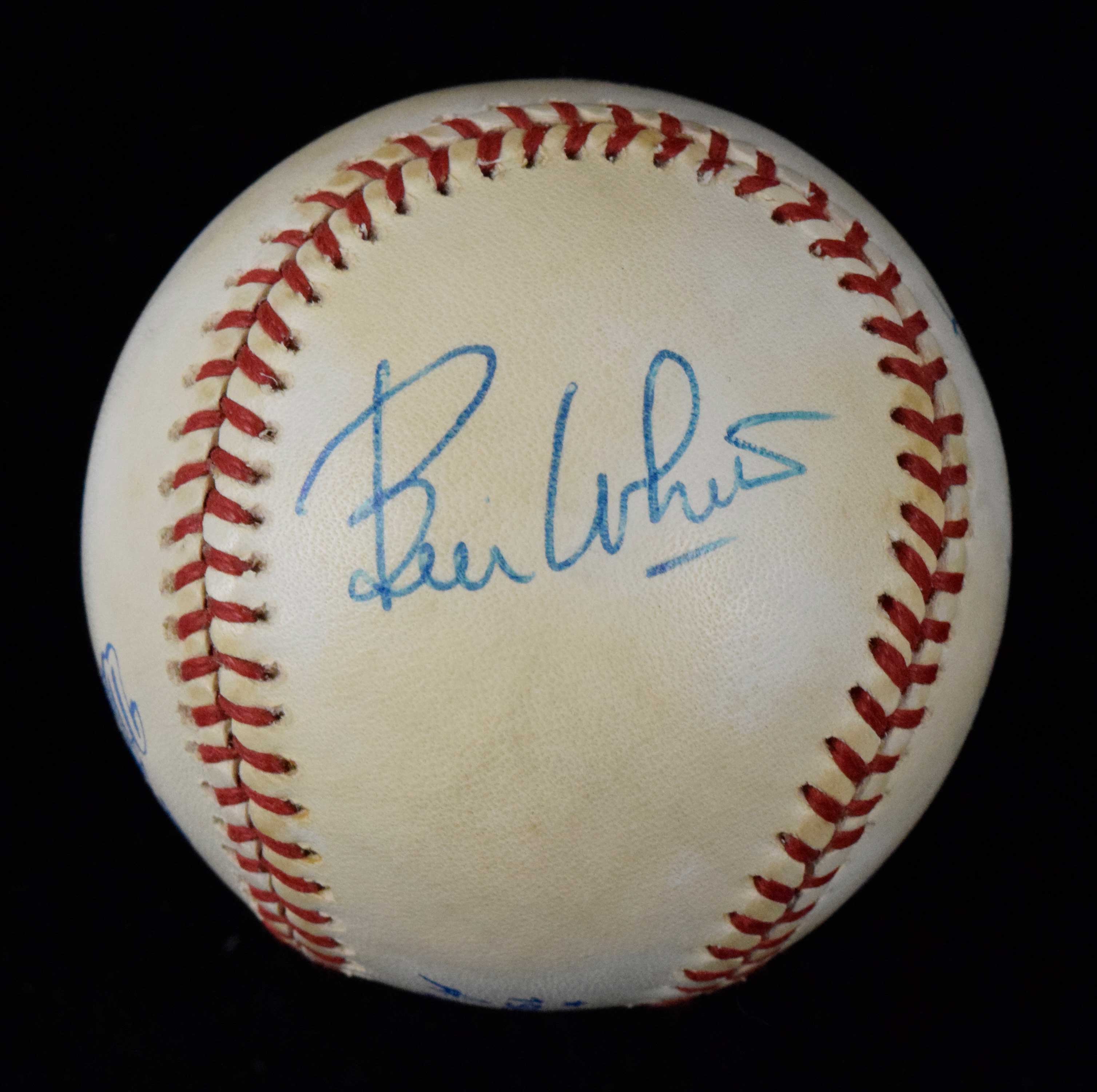 Description:Bobby Brown, Bill White, and Fay Vincent multi-signed 1989 World Series baseball - JSA (EX). All three signed the ball in blue ink. Signatures rate 8 to 9 out of 10. JSA serial #ed sticker is on the ball. Areas of toning on each panel: EX