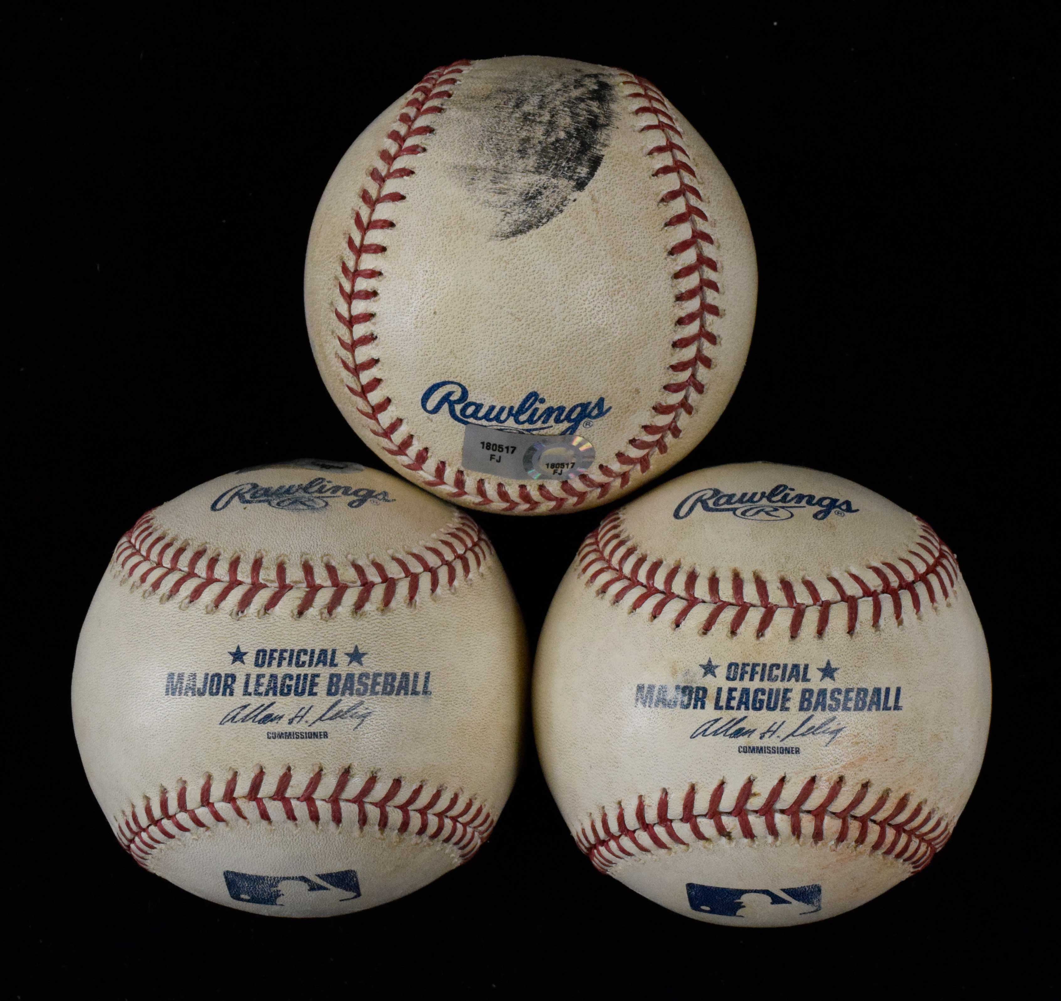 Description:Lot of (3) 2010 NLDS game used baseballs - MLB Authenticated (VG/EX-EX). All are from Game 3. Includes a ball used in the 1st inning foul tipped by Brian McCann, and (2) balls used in the 7th inning pitched by Jonathan Sanchez to Brian McCann both for balls in the dirt. MLB Authenticated serial #ed hologram sticker is on each: VG/EX-EX