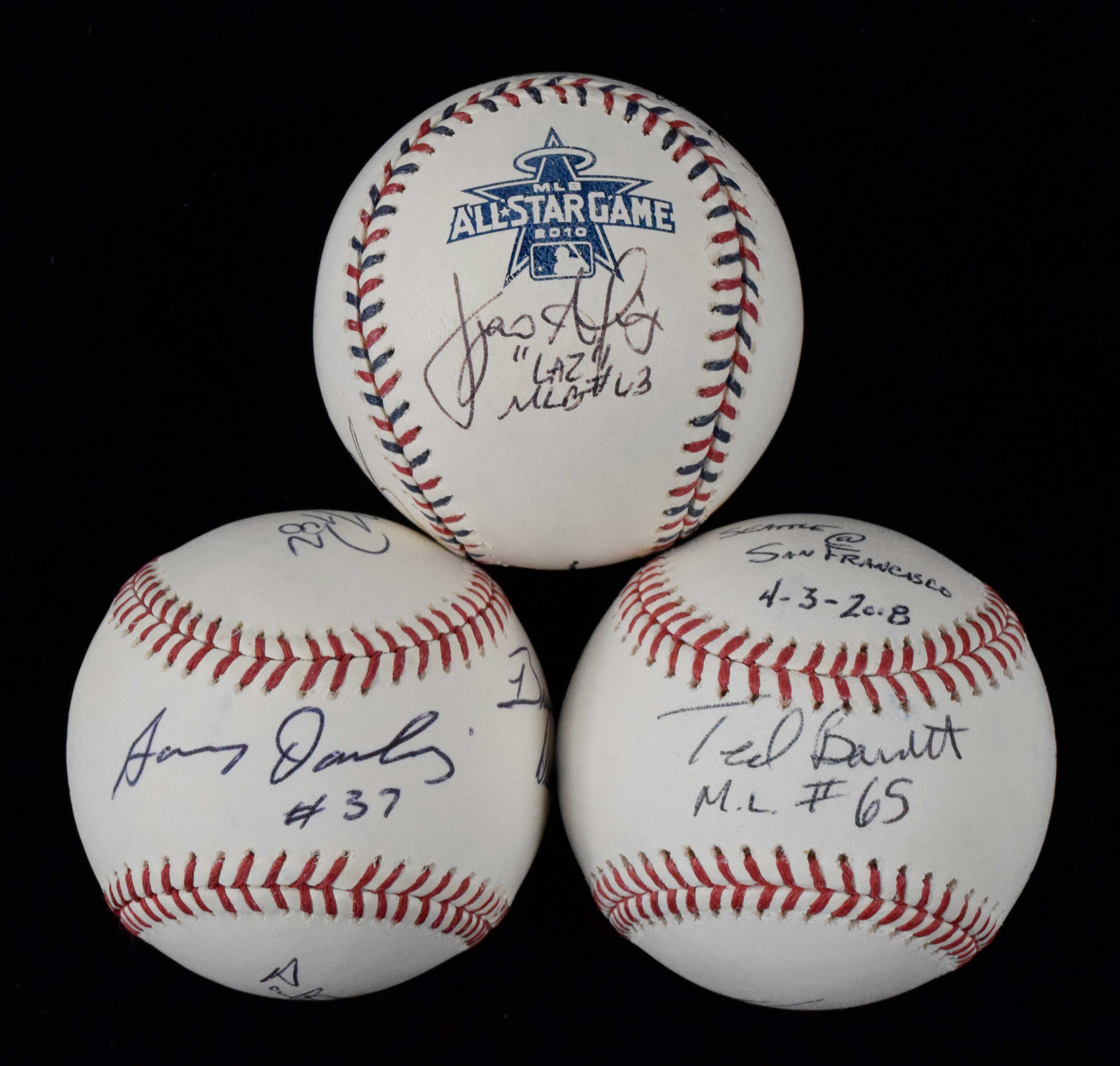 Description:Lot of (3) umpiring crew multi-signed baseballs (NM-NM/MT). Includes 2010 All-Star Game ball signed by Mike Reilly, Mike Winters, Brian O'Nora, Laz Diaz, Bruce Dreckman, and Jim Wolf (LOA from Umps Care); 2013 Opening Day ball signed by San Francisco Giants at Los Angeles Dodgers umpires Gary Darling, Paul Emmel, Bruce Dreckman, and Clint Fagan; 2018 Opening Day ball signed by Seattle Mariners at Giants umpires Ted Barrett, Lance Barksdale, Roberto Ortiz Maymi, and Will Little (LOA from Umps Care). Signatures rate 6/7 to 9/10 (avg 8) out of 10: NM-NM/MT