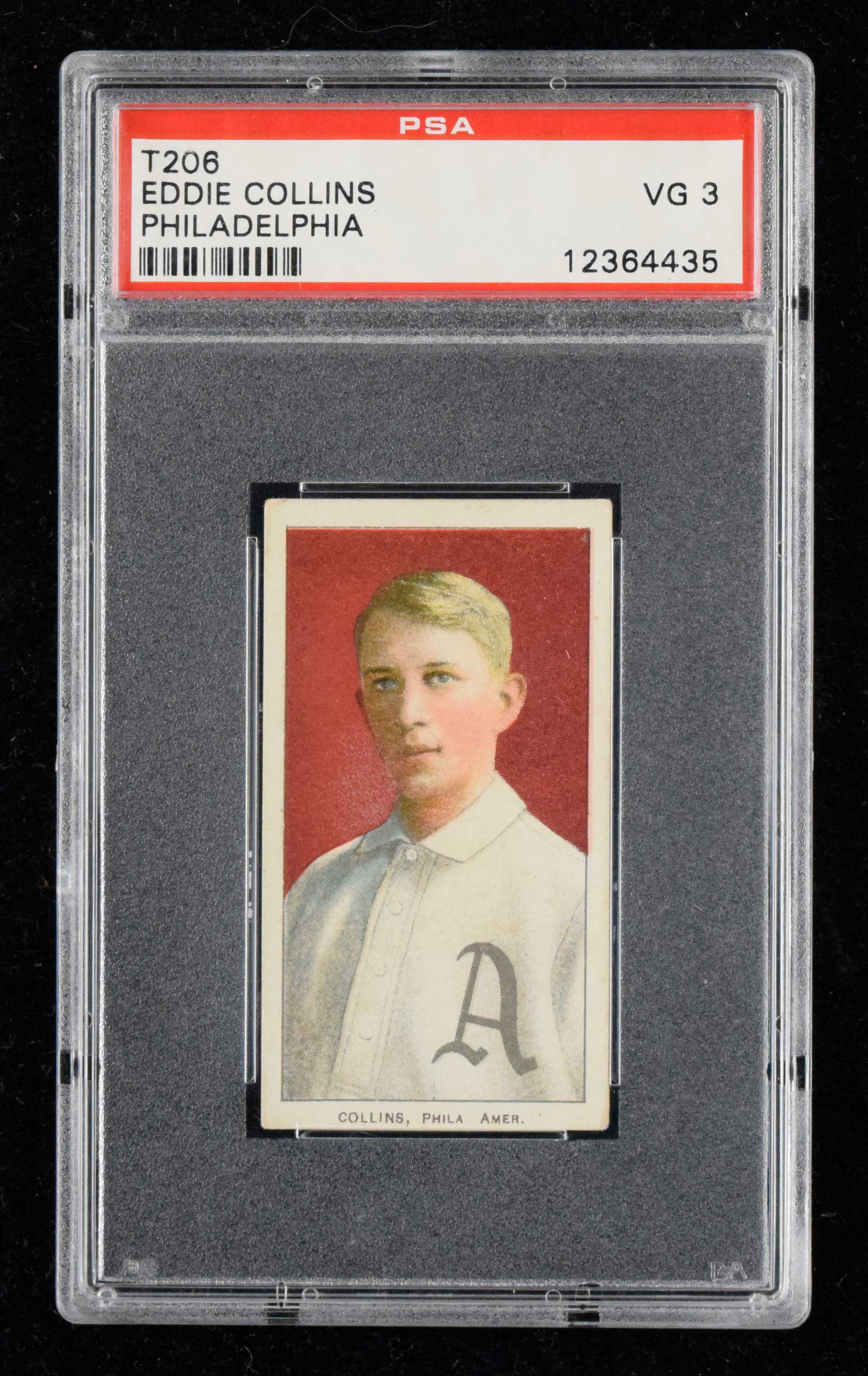 Description:1909-11 T206 Sweet Caporal Eddie Collins (PSA VG 3) Nice eye appeal with card showing a touch of light wear (hint of wear to case): PSA VG 3 ($500-$750)
