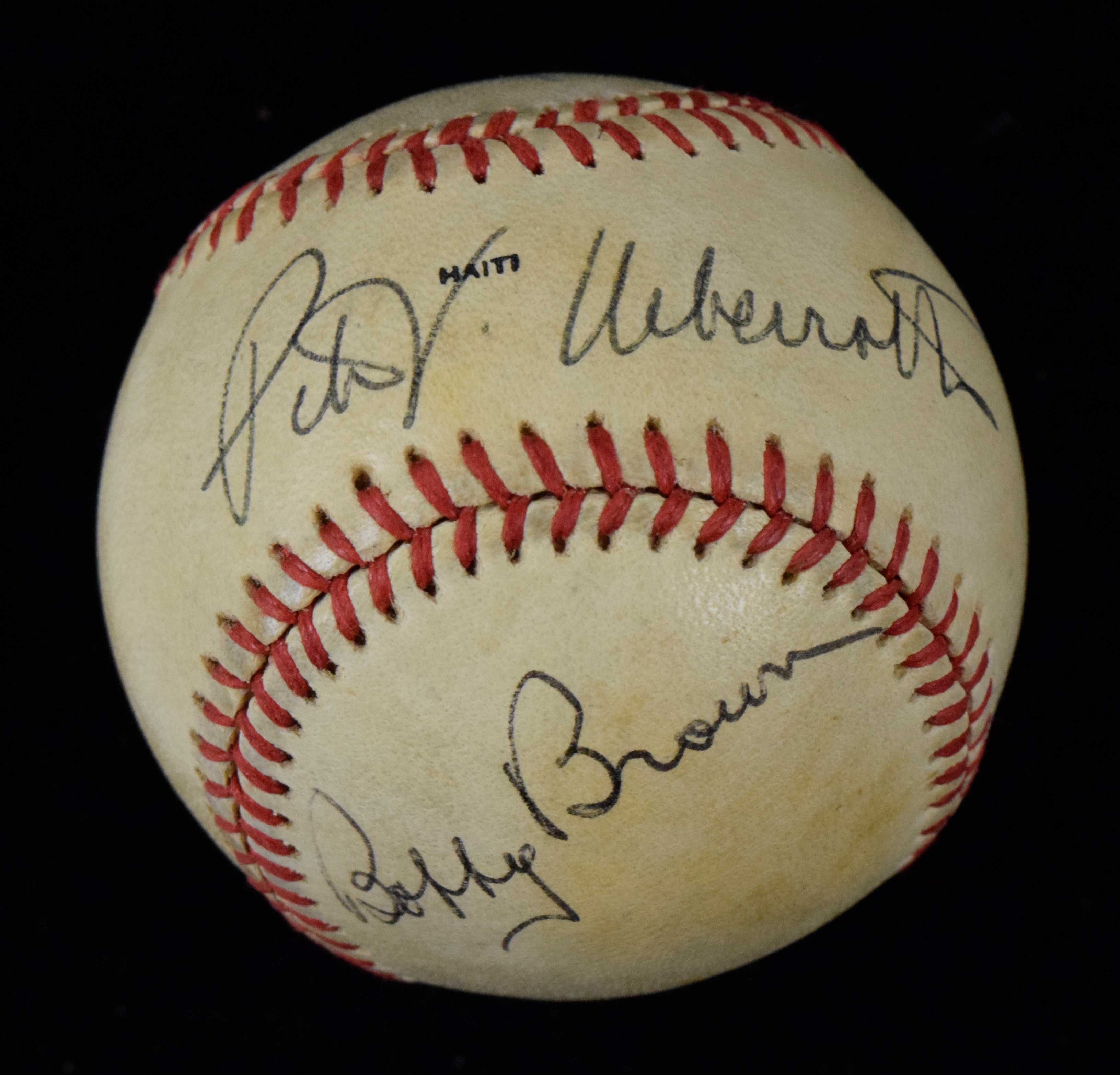 Description:Bobby Brown, Peter Ueberroth, and Chub Feeney multi-signed 1985 World Series baseball (EX). All three signed the ball in either blue or black ink. Signatures rate 8 to 9 out of 10. Areas of toning on each panel: EX