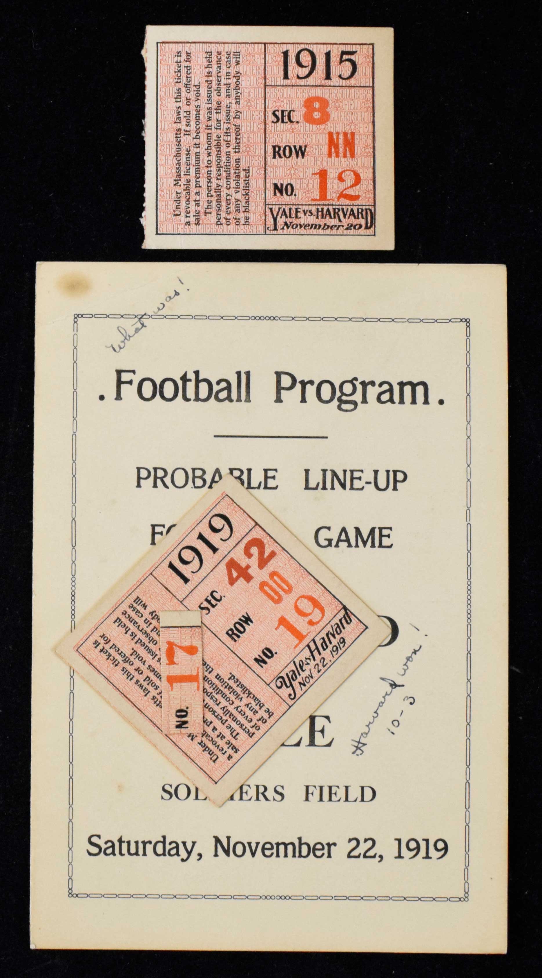 Description:1915 Yale at Harvard ticket stub plus 1919 Yale at Harvard ticket stub & program (see description). Includes 11/20/1915 Yale at Harvard ticket stub (VG), and 11/22/1919 Yale at Harvard ticket stub glued to the program (lengthy description of exciting game written inside by attendee).