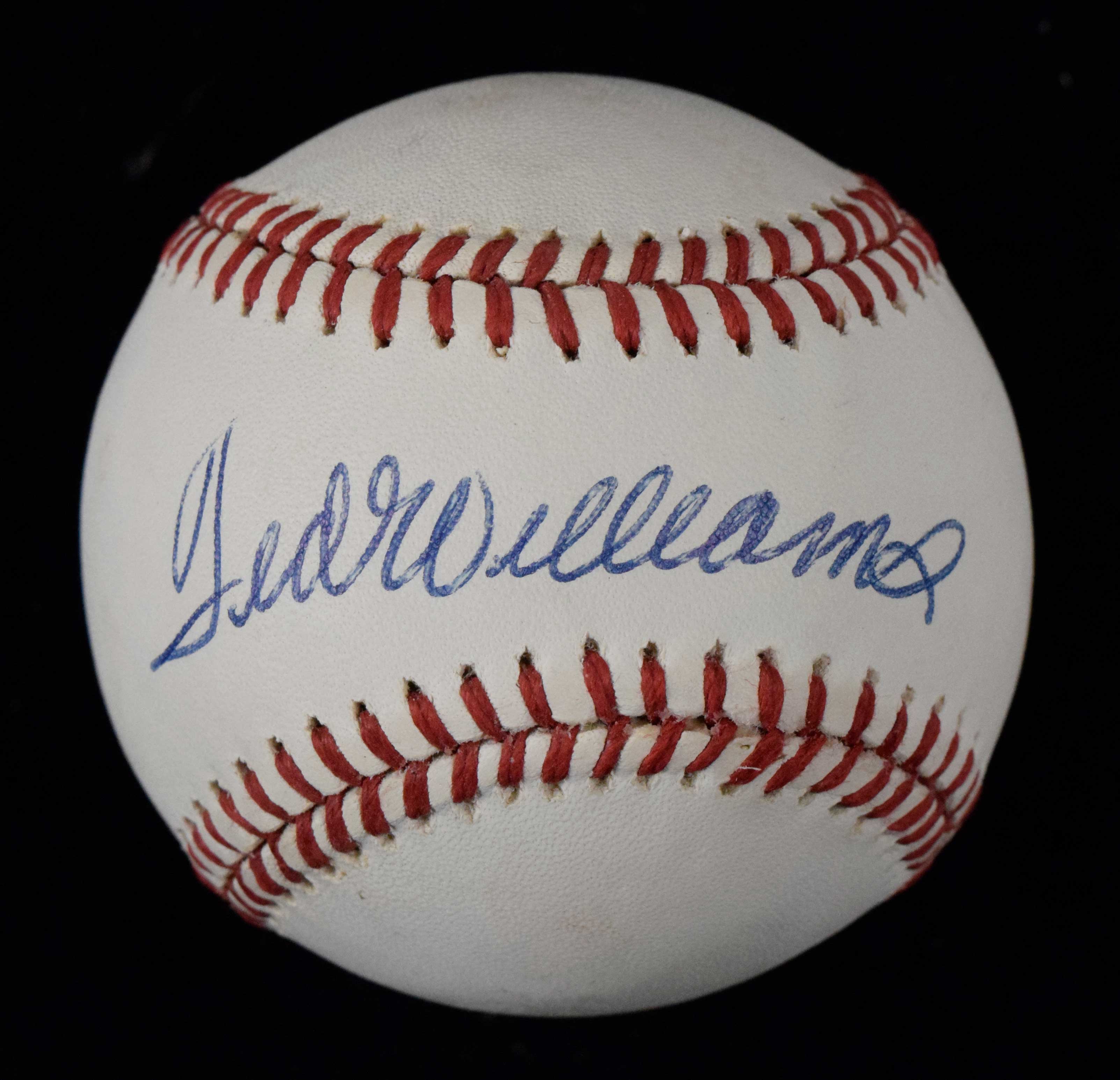 Description:Ted Williams signed B.Brown AL baseball (EX/MT). Williams signed the sweet spot in blue ink. Signature rates 8/9 out of 10. Light toning on side panels: EX/MT
