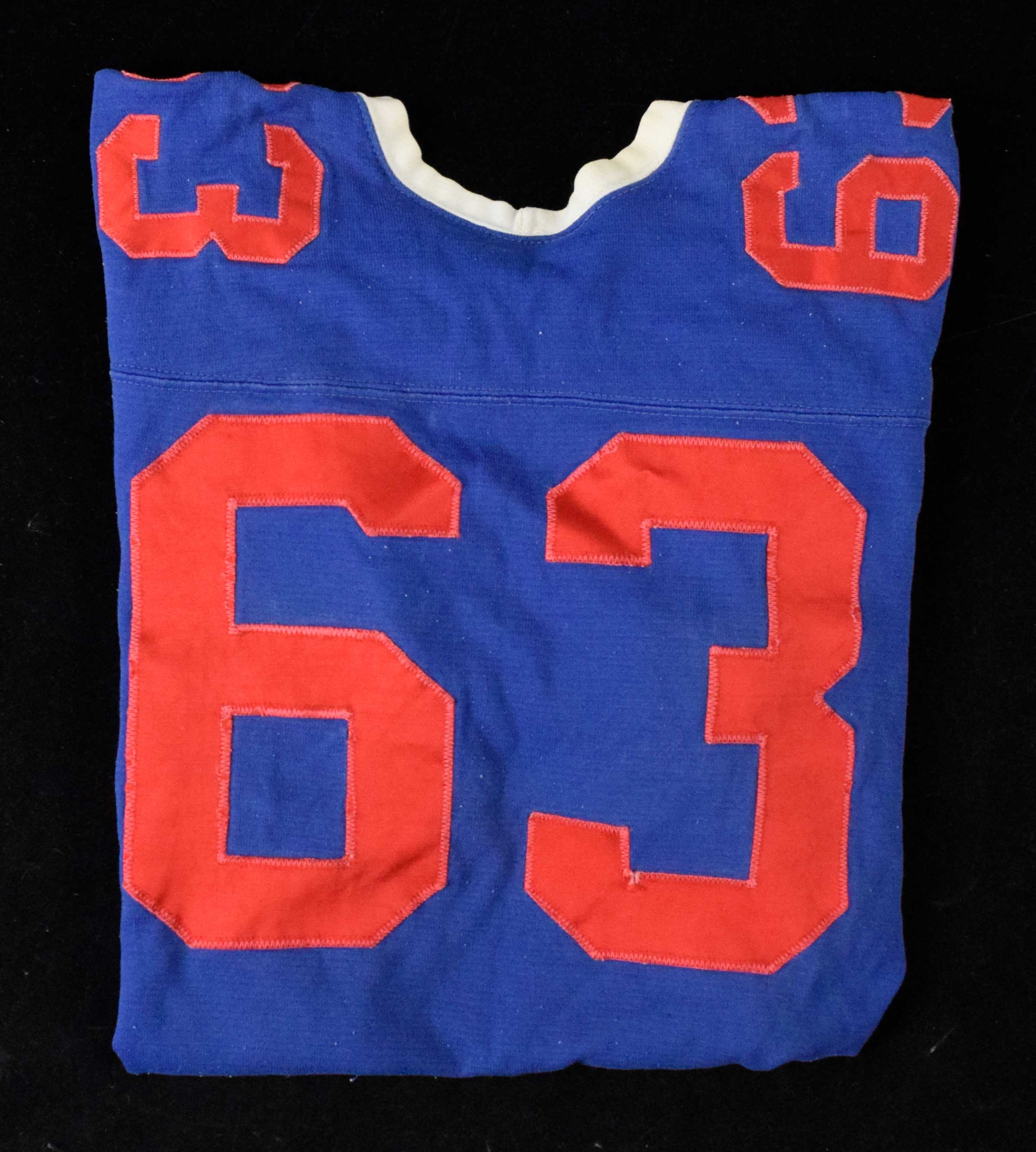 Description:Vintage all-star football jersey, c.1958-66 (EX/MT). Wilson size 44 blue #63 jersey with red and white trim. 1958-66 era Wilson tag is on the front tail: EX/MT