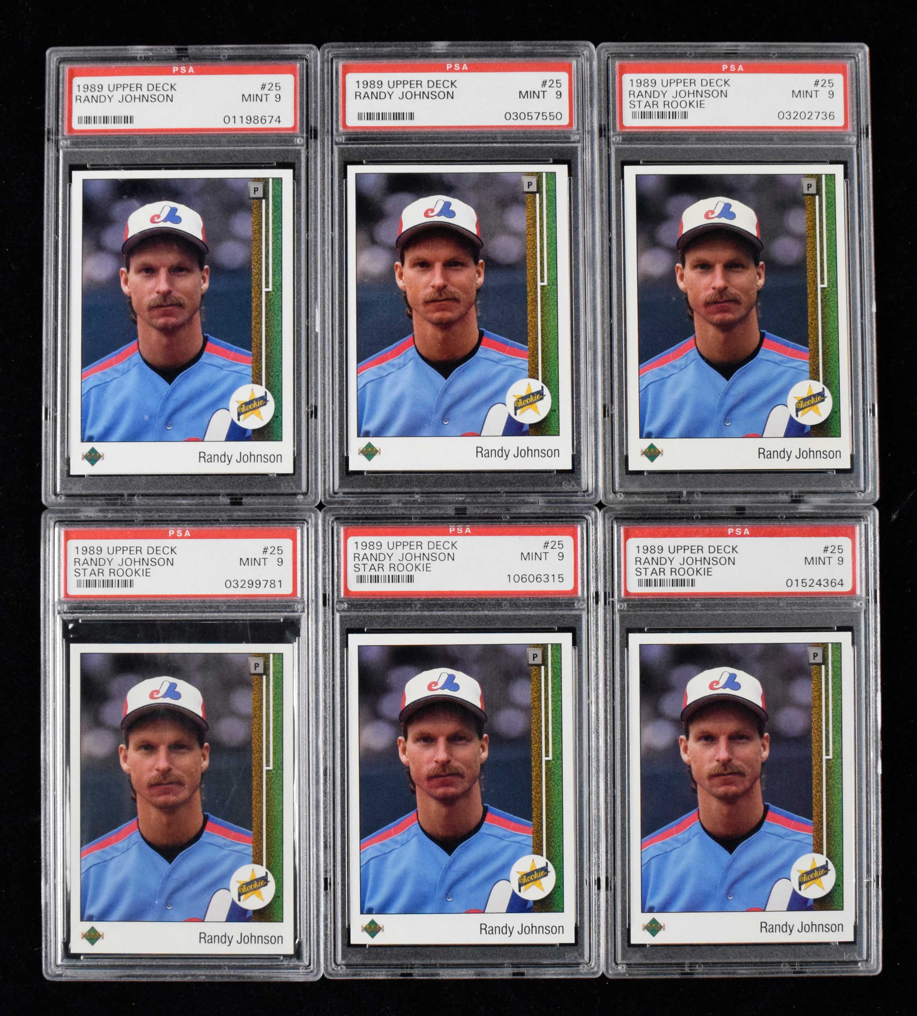 Description:Lot of (24) 1989 Upper Deck #25 Randy Johnson rookie cards (NM-MT). Most appear to average NM/MT overall, and includes (8) graded PSA 9 MT. Range: NM-MT