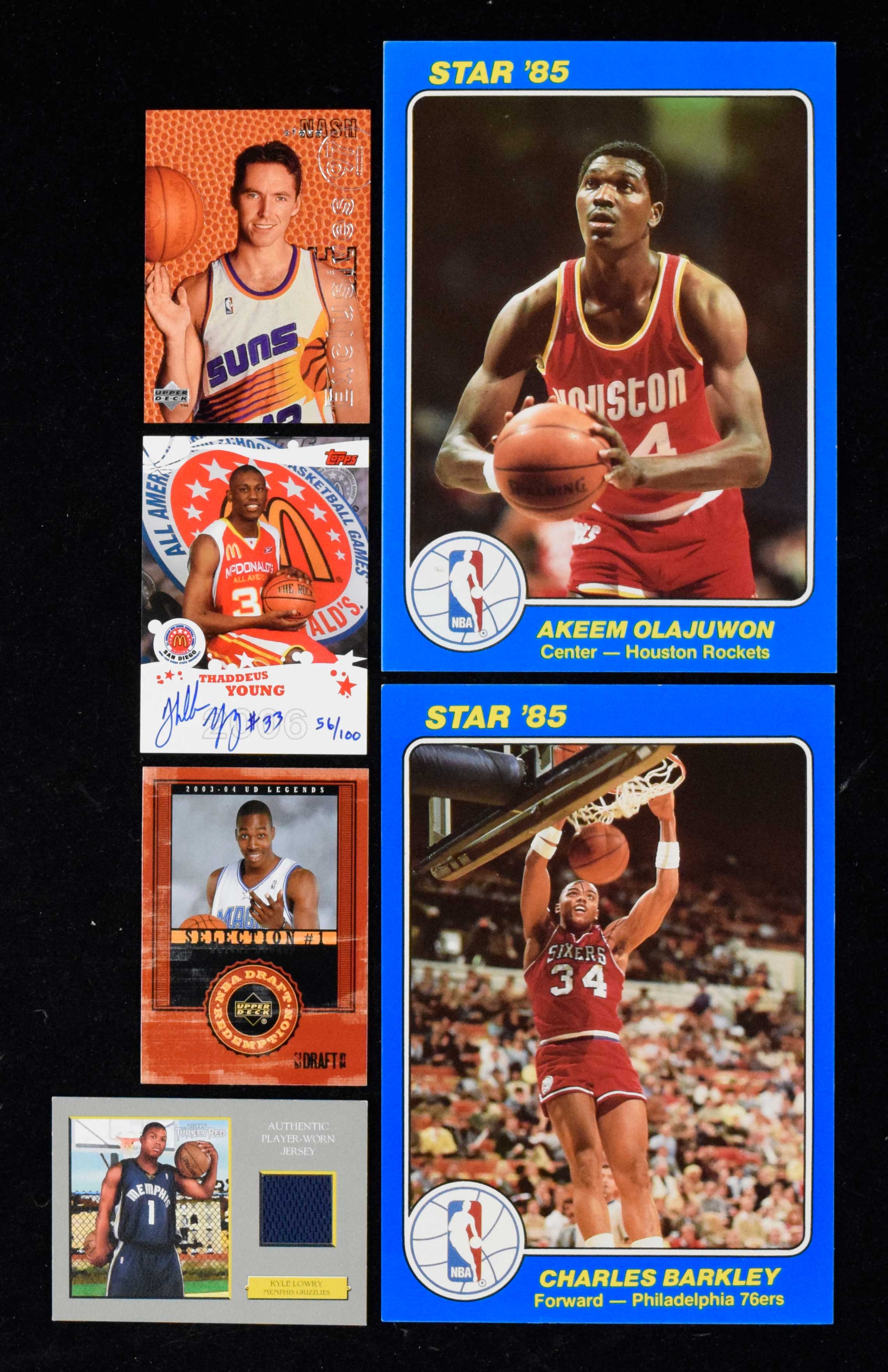 Description:Lot of (37) basketball cards with stars, HOFers, rookies, and signed relic cards (EX-NM/MT). Incl. 1984-85 Star "Court Kings" #s 41 Charles Barkley (EX) and 47 Akeem Olajuwon (EX), 1992-93 Upper Deck #474 Shaquille O'Neal, (9) 1996-97 Upper Deck "Rookie Exclusives" #R18 Steve Nash, 1996-97 SP #143 Jermaine O'Neal, 2003-04 Upper Deck Legends #136 Dwight Howard, 2006-07 Topps Turkey Red "Relics" TRR-KL Kyle Lowry, (11) 2007-08 Topps Echelon "McDonald's All-American Game Day Autos" #B12 signed by Thaddeus Young, 2007-08 Topps Echelon "McDonald's All-American Autos Five-Piece Relic" #MAR-TY signed by Thaddeus Young (#ed 2/75), (2) 2007-08 Topps Finest "Rookie Autos Refractor" #80 signed by Thaddeus Young, (2) 2007-08 Topps Letterman "Patches Jersey Number Autos" #JNA-TY signed by Thaddeus Young (#ed 47/75 and 55/75), 2007-08 Topps Letterman "Patches Team Logo Autos" #TLA-TY signed by Thaddeus Young (#ed 5/9), 2007-08 Topps Letterman "Patches Team Logo Autos Refractor" #TLA-TY signed by Thaddeus Young (#ed 1/5), (2) 2007-08 Stadium Club "Chrome Rookie X-Fractor Autos" #112 signed by Thaddeus Young, 2008 Topps McDonald's All-American Game "Game Day Autos" #GM signed by Greg Monroe, 2008-09 Topps Chrome "Youthquake Autos X-Fractor" #YQA15 signed by Thaddeus Young (#ed 3/15). Average NM overall. Range: EX-NM/MT
