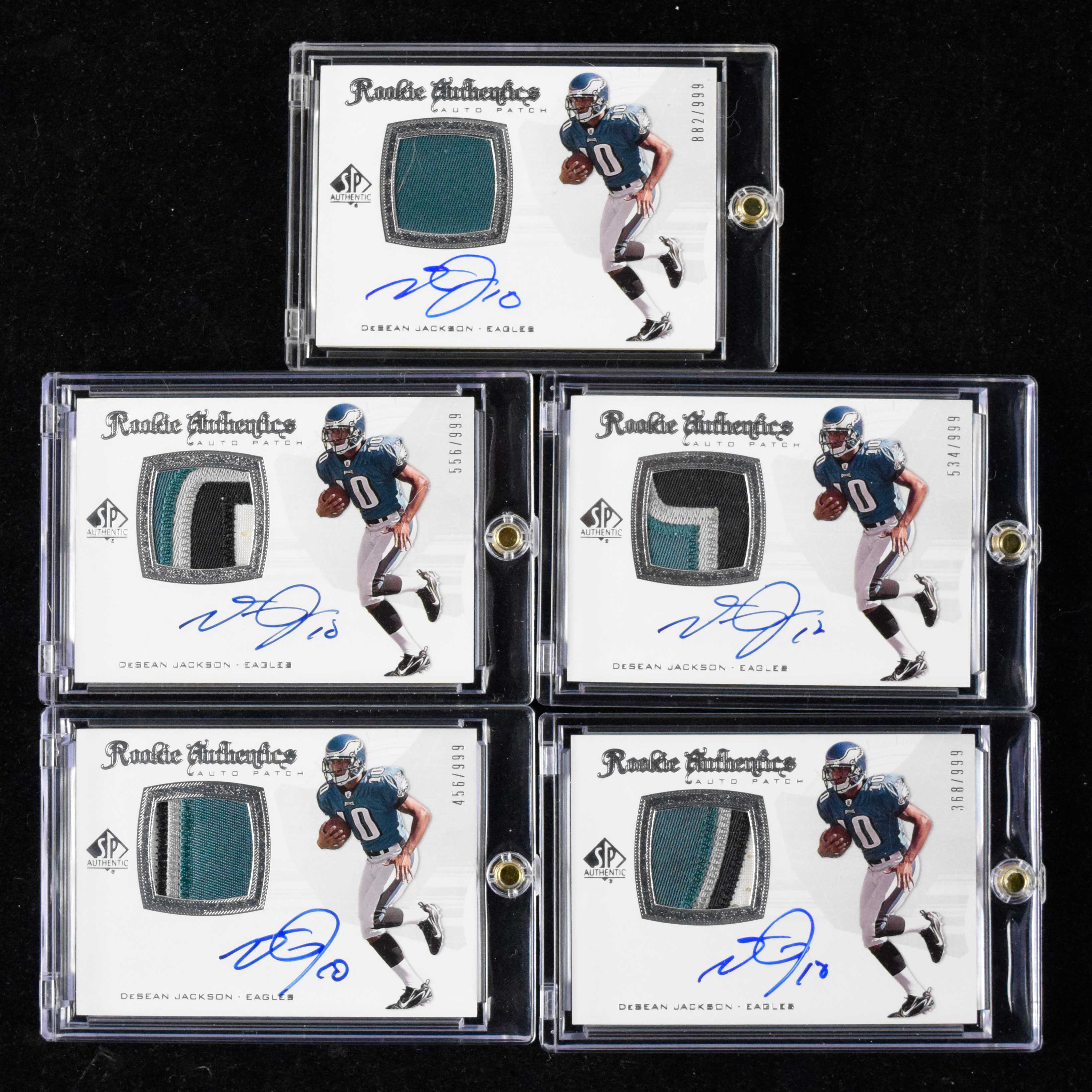 Description:Lot of (5) DeSean Jackson signed 2008 SP Authentic serial #ed rookie patch autograph cards (NM-NM/MT). Includes (5) 2008 SP Authentic #290 patch cards all signed by Jackson in blue marker. Signatures rate 8/9 to 10 out of 10. The cards are numbered out of 999: NM-NM/MT
