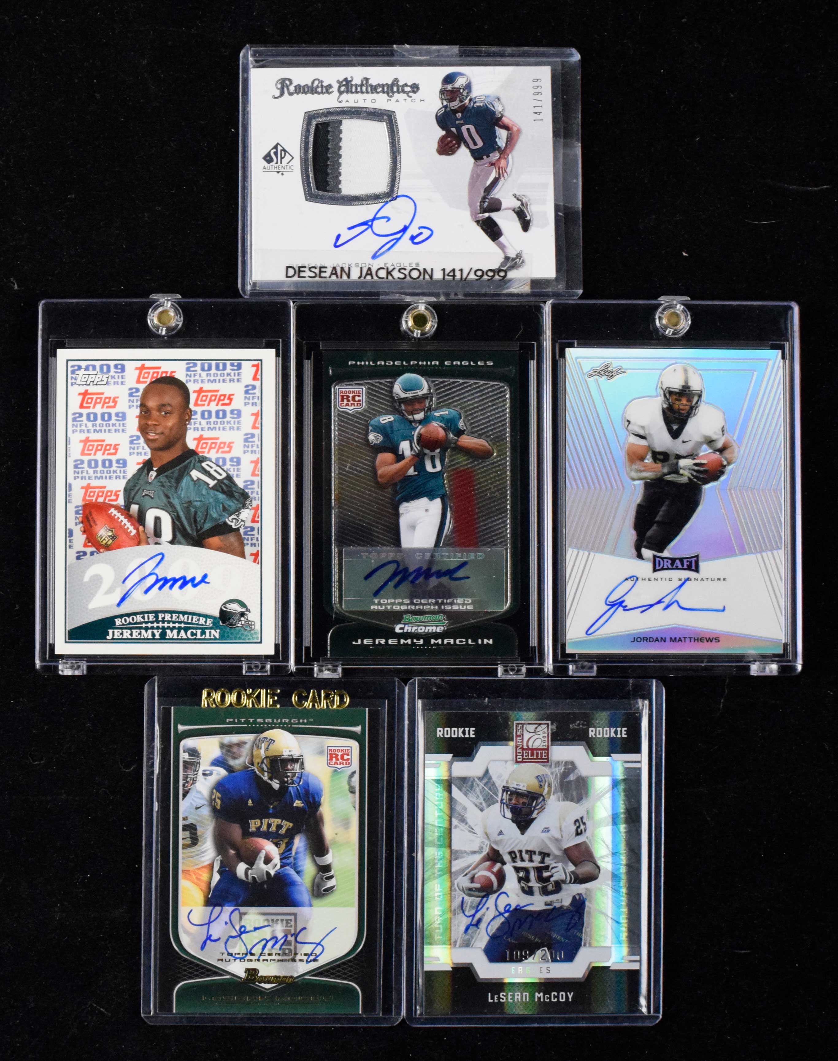 Description:Lot of (8) signed football rookie cards including serial numbered (NM-NM/MT). Includes 2008 Donruss Elite #147 signed by DeSean Jackson (#ed 47/249), 2008 SP Authentic #290 patch card signed by DeSean Jackson (#ed 141/999), 2009 Topps "Rookie Premiere Autographs" #RPA-JM signed by Jeremy Maclin, 2009 Bowman Draft Picks "Rookie Autographs" #170 signed by LeSean McCoy, 2009 Bowman Chrome "Rookie Autographs" #140 signed by Jeremy Maclin, 2009 Donruss Elite "Turn of the Century Autographs" #160 signed by LeSean McCoy (#ed 109/200), 2014 Bowman "Chrome Rookie Autographs Refractors" #62 signed by Jordan Matthews, and 2014 Leaf Metal Draft #BA-JM3 signed by Jordan Matthews. Signatures rate 8/9 to 10 out of 10: NM-NM/MT