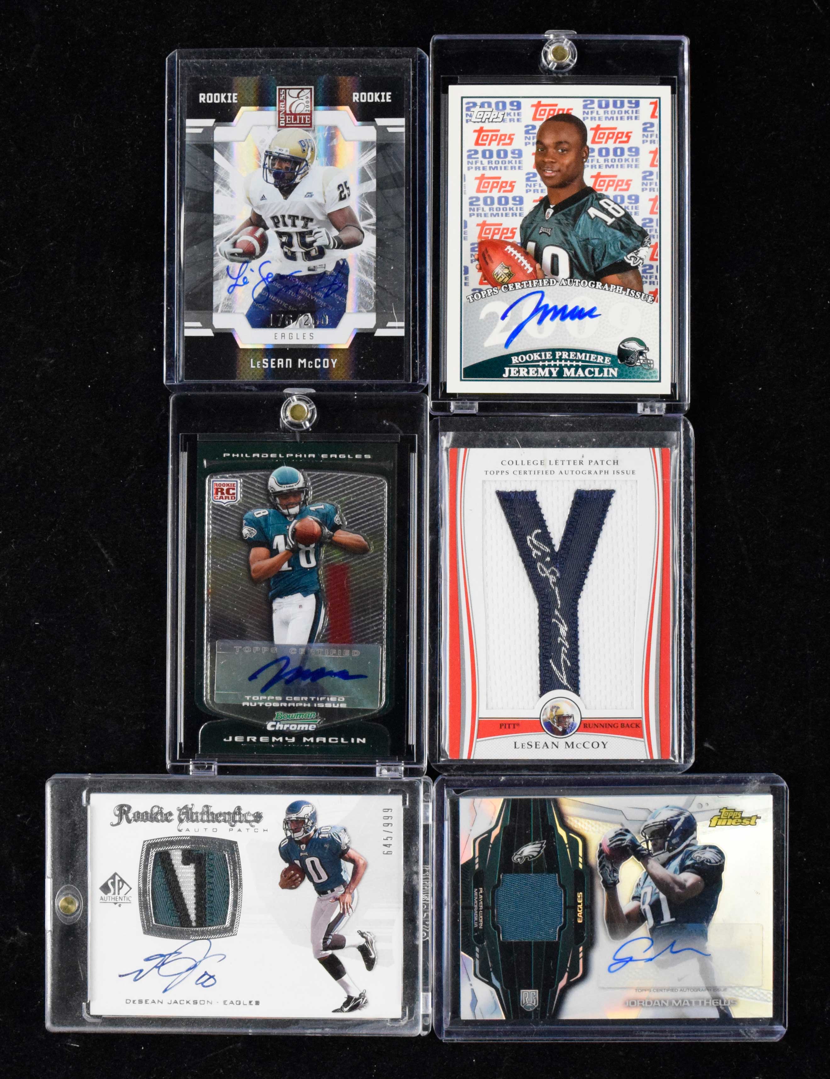 Description:Lot of (8) signed football rookie cards including serial numbered (NM-NM/MT). Includes 2008 SP Authentic #290 patch card signed by DeSean Jackson (#ed 645/999), 2008 SP Rookie Edition "Autographs" #166 signed by DeSean Jackson, 2009 Topps "Rookie Premiere Autographs" #RPA-JM signed by Jeremy Maclin, 2009 Bowman Chrome "Rookie Autographs" #140 signed by Jeremy Maclin, 2009 Bowman Draft Picks "College Letter Patch Autographs" #LAP-LMC signed by LeSean McCoy (#ed 27/52), 2009 Donruss Elite "Turn of the Century Autographs" #160 signed by LeSean McCoy (#ed 176/200), 2014 Topps Finest "Rookie Patch Autographs Refractors" #RAP-JMA signed by Jordan Matthews, and 2014 Panini Elite "Rookie Autographs" #25 signed by Jordan Matthews. Signatures rate 8 to 10 out of 10: NM-NM/MT