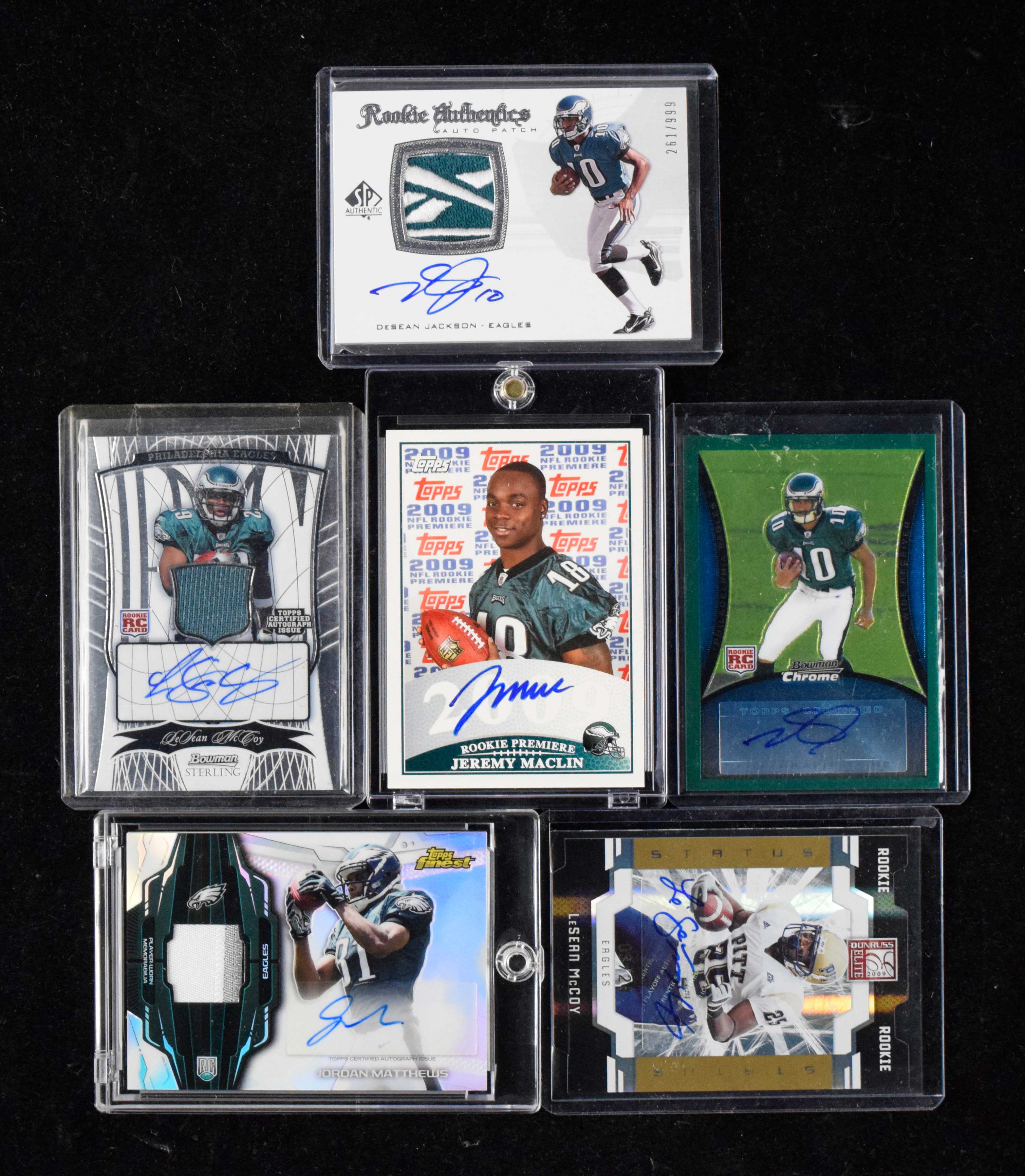 Description:Lot of (8) signed football rookie cards including serial numbered (NM-NM/MT). Includes 2008 Bowman Chrome "Rookie Autographs Green" #BC93 signed by DeSean Jackson (#ed 47/150), 2008 SP Authentic #290 patch card (Reebok logo) signed by DeSean Jackson with (#ed 261/999), 2009 Topps "Rookie Premiere Autographs" #RPA-JM signed by Jeremy Maclin, 2009 Bowman Chrome "Rookie Autographs" #140 signed by Jeremy Maclin, 2009 Bowman Sterling #155 jersey card signed by LeSean McCoy (#ed 68/150), 2009 Donruss Elite "Status Autographs Gold" #160 signed by LeSean McCoy (#ed 3/24), 2014 Topps Finest "Rookie Patch Autographs Refractors" #RAP-JMA signed by Jordan Matthews, and 2014 Panini Elite "Rookie Autographs" #25 signed by Jordan Matthews. Signatures rate 8/9 to 10 out of 10: NM-NM/MT